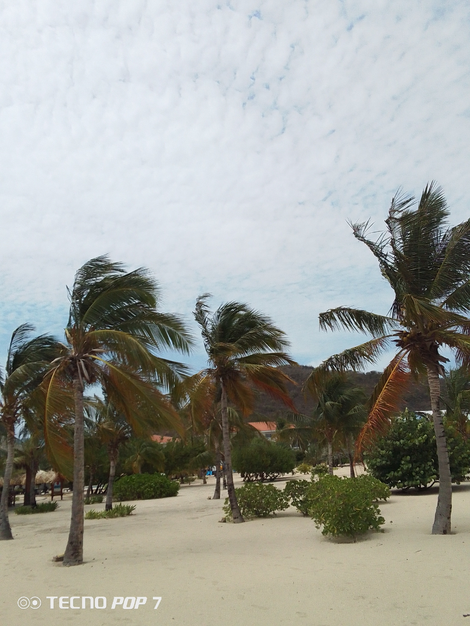 The image shows a sandy beach in Pedro González, Venezuela, populated with palm trees. The trees are swaying in the wind. The sky is overcast with scattered clouds. Small bushes are scattered througho…read more