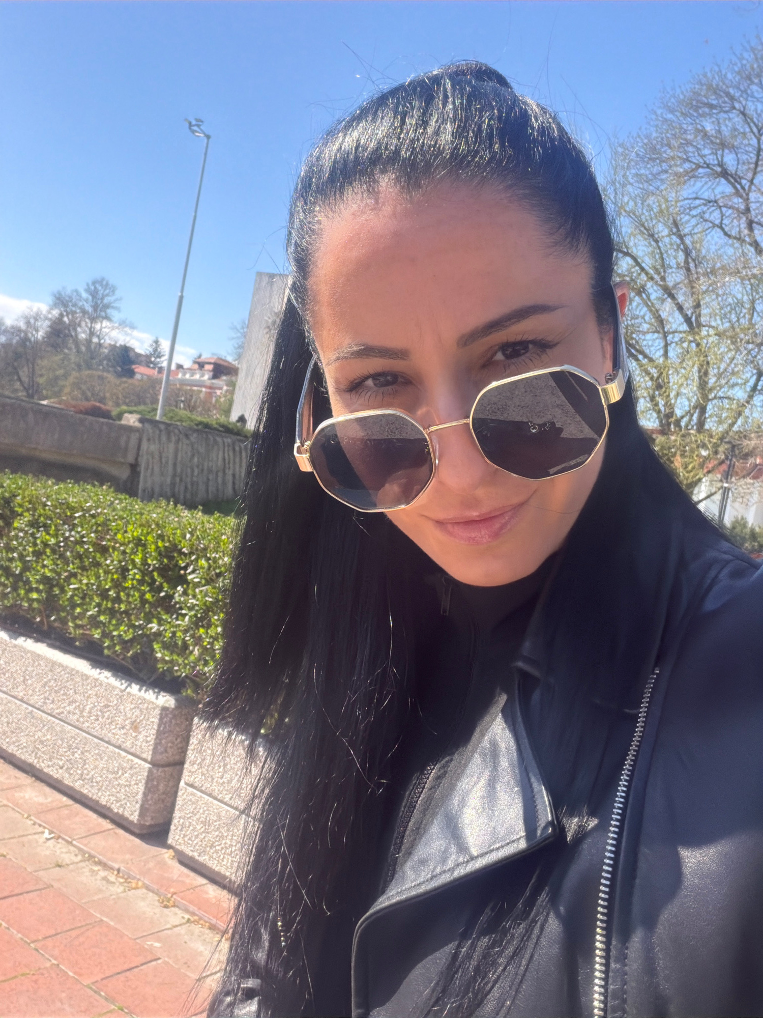 A woman with dark hair pulled back and wearing sunglasses and a black leather jacket poses outdoors. The background shows greenery, buildings, and a blue sky, suggesting an urban environment in Pleven…read more