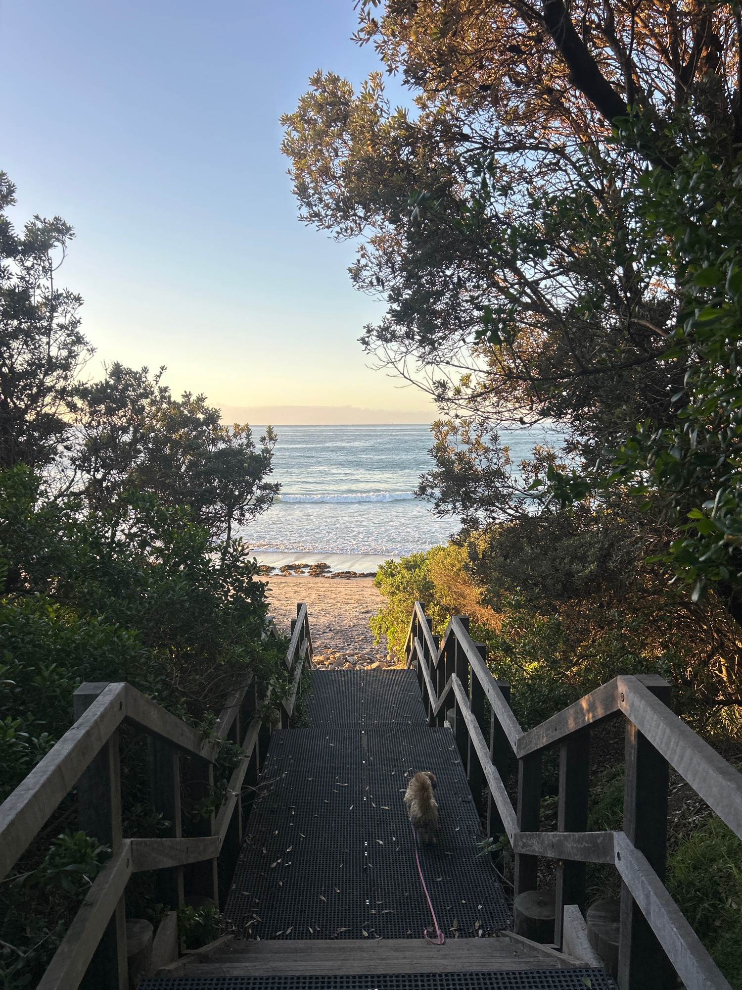 The image depicts a descending staircase leading towards a beach in Bulli, Australia. The staircase is constructed with grey wooden railings and black metal steps. Vegetation, including trees and shru…read more