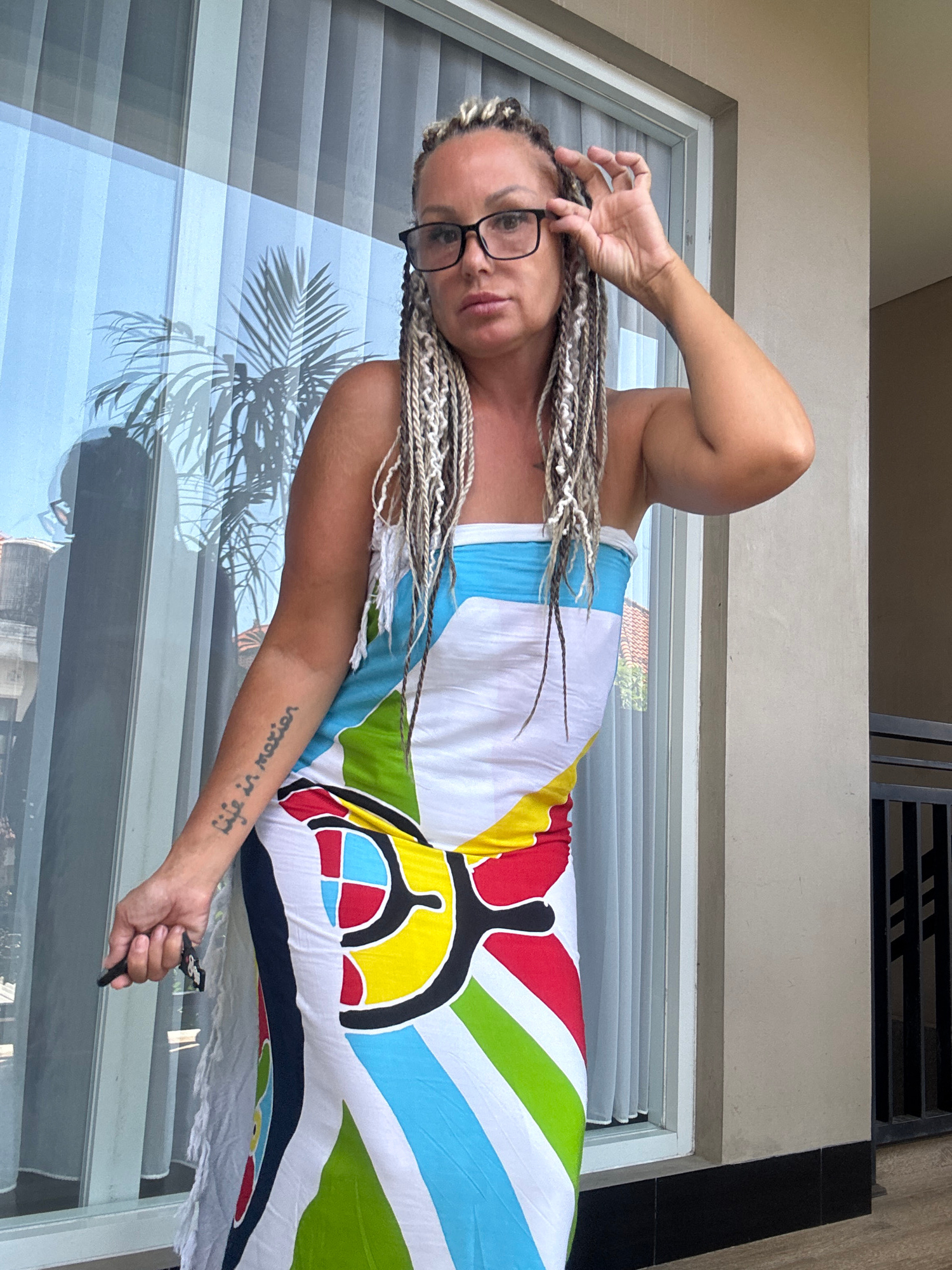 The image depicts a woman with blonde-streaked braids and glasses, wearing a colorful patterned dress, standing on a balcony. Her left hand is near her face, adjusting her glasses. Her right arm has a…read more