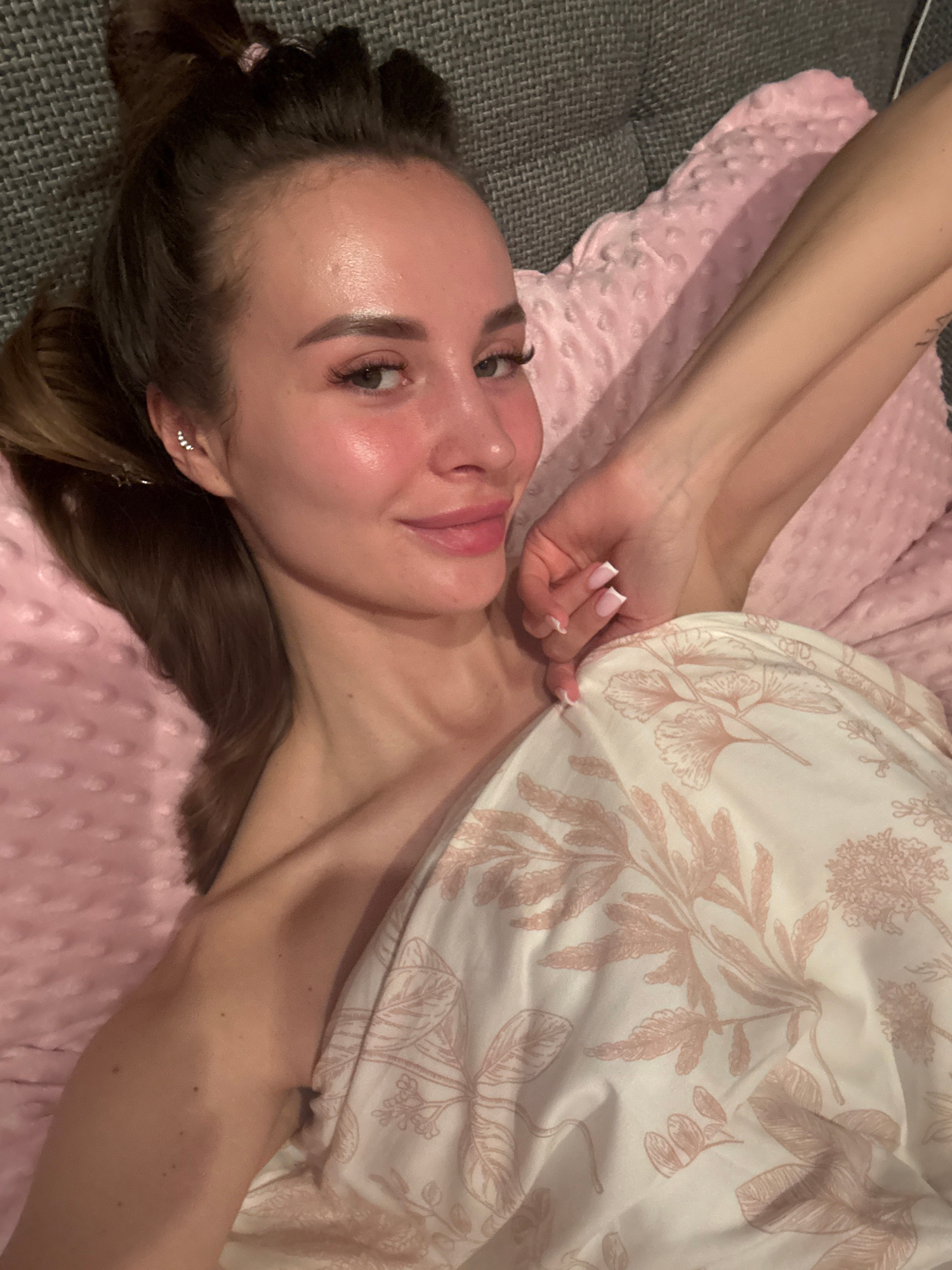 A young woman is lying on her back on a pink, textured blanket. Part of her body is covered by a white blanket with a pink floral pattern. She is looking at the camera with a slight smile. Her hair is…read more