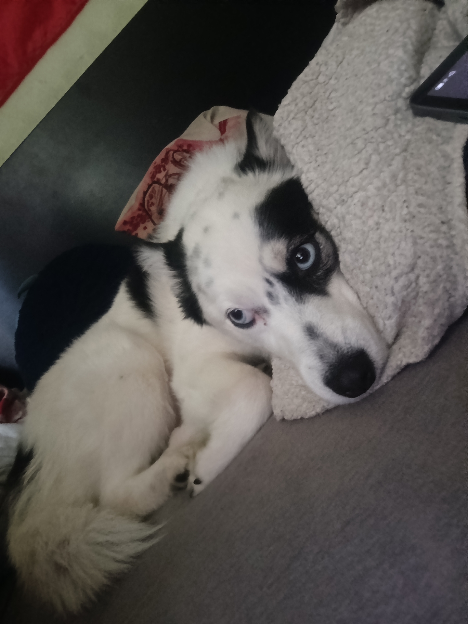 A medium-length-haired dog with blue eyes is curled up on a gray surface. The dog is primarily white with black markings around its eye and on its back. It rests its head on a textured, white cushion.…read more