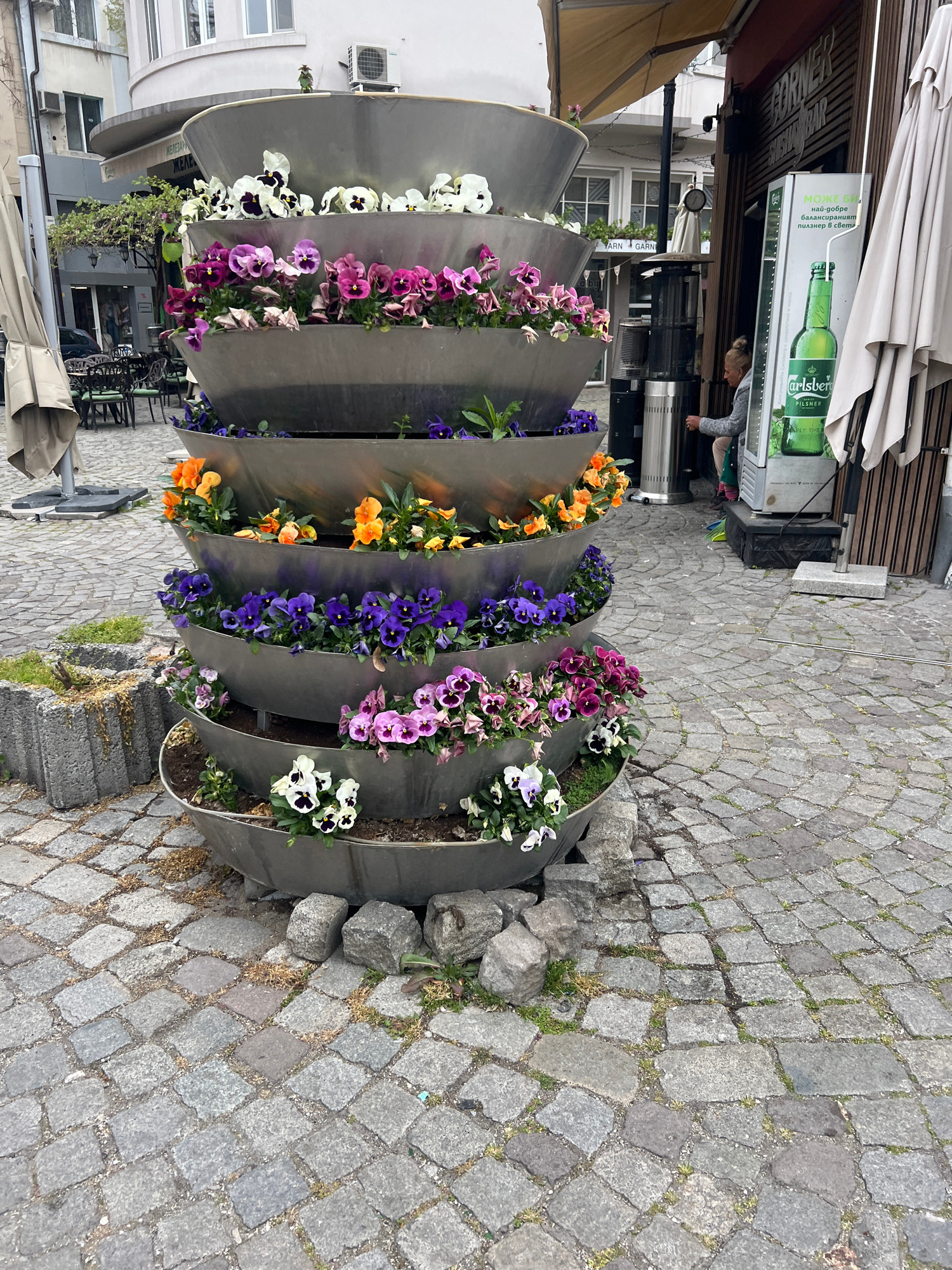 The image shows a modern, metallic flower display in Plovdiv, Bulgaria. The display consists of several curved metal planters arranged in a row, each containing different colored pansies (white, purpl…read more