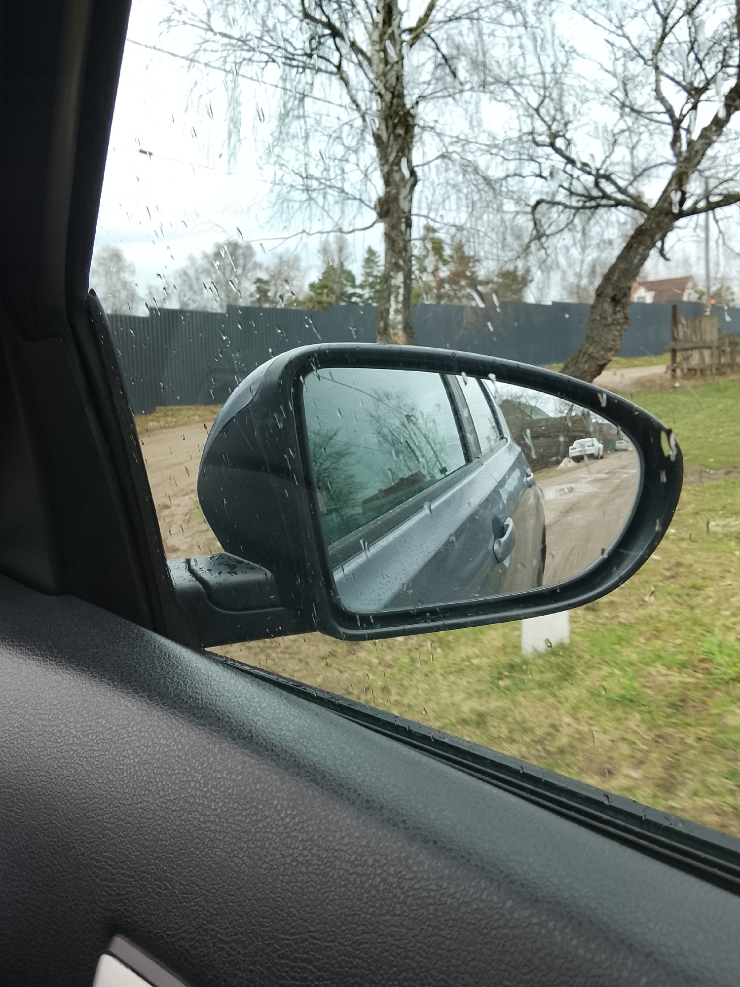 The image shows the view from inside a car, focusing on the driver-side rearview mirror. The mirror reflects a gray or silver car traveling on a dirt road. In the background of the mirror's reflection…read more