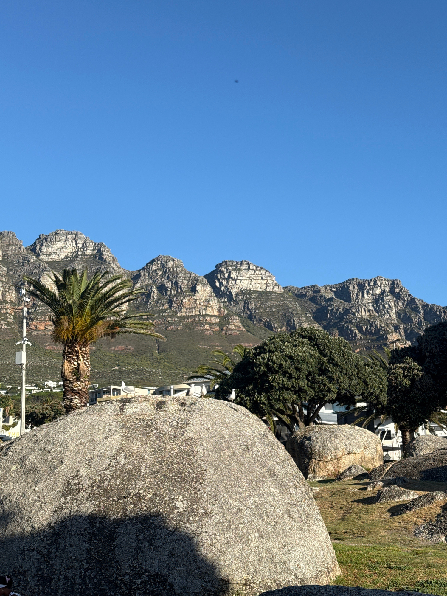 The image displays a sunlit coastal landscape in Cape Town, South Africa, featuring the Twelve Apostles mountain range. The upper portion of the frame consists of a clear, deep blue sky, with a small…read more