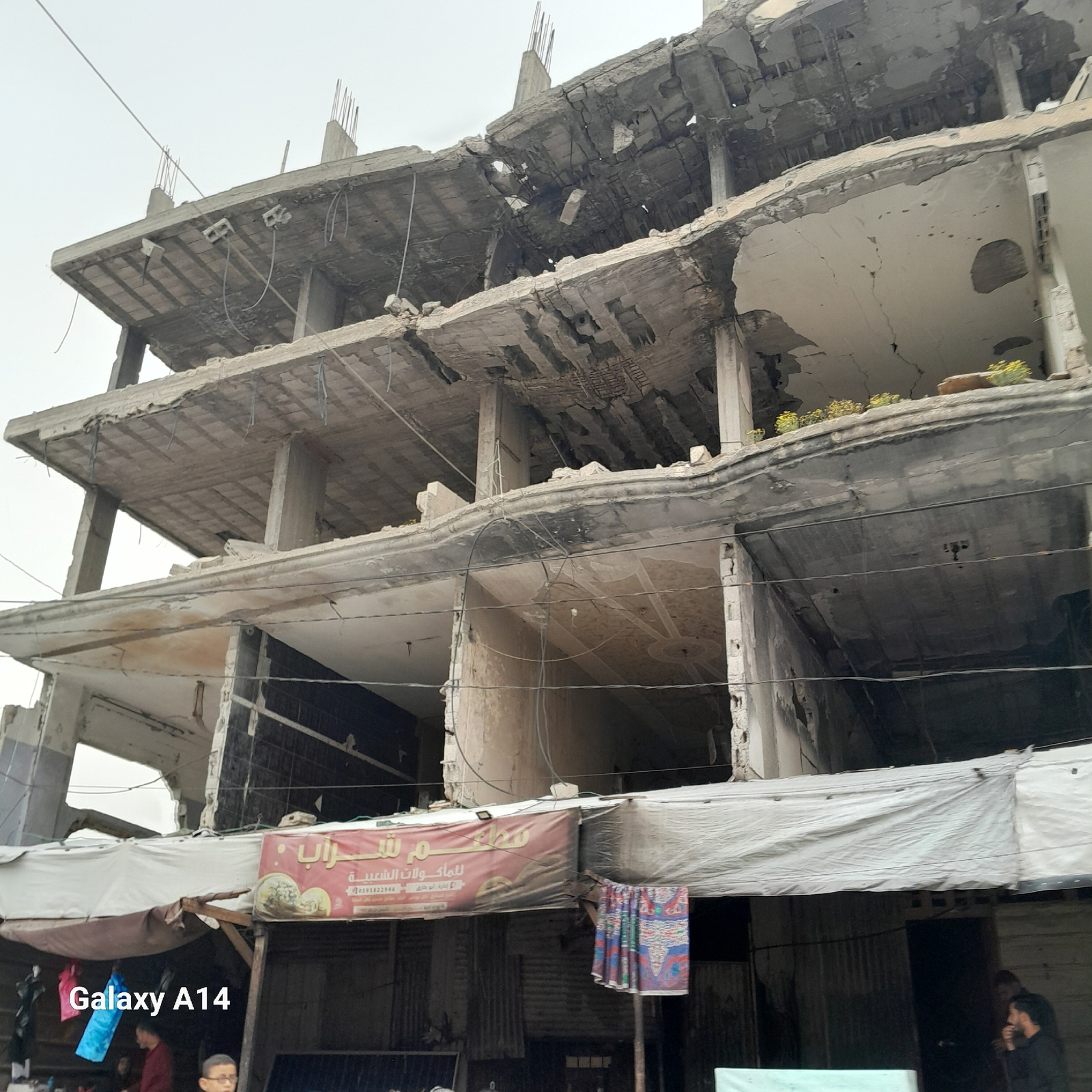 The image shows a partially destroyed building in Khan Yunis, Palestinian Territory. The building's structural integrity is severely compromised, with exposed concrete and rebar visible on multiple floors. Debris and remnants of interior walls are present. A banner or sign is attached to the remaining facade, partially obscured by white cloth. Adjacent to the damaged structure, there are signs of street-level commerce, including fabric and what appears to be a commercial advertisement. In the lower right of the image, there are people, partially obscured. The image is taken from a low angle, looking upwards at the damaged building. | Open Wire