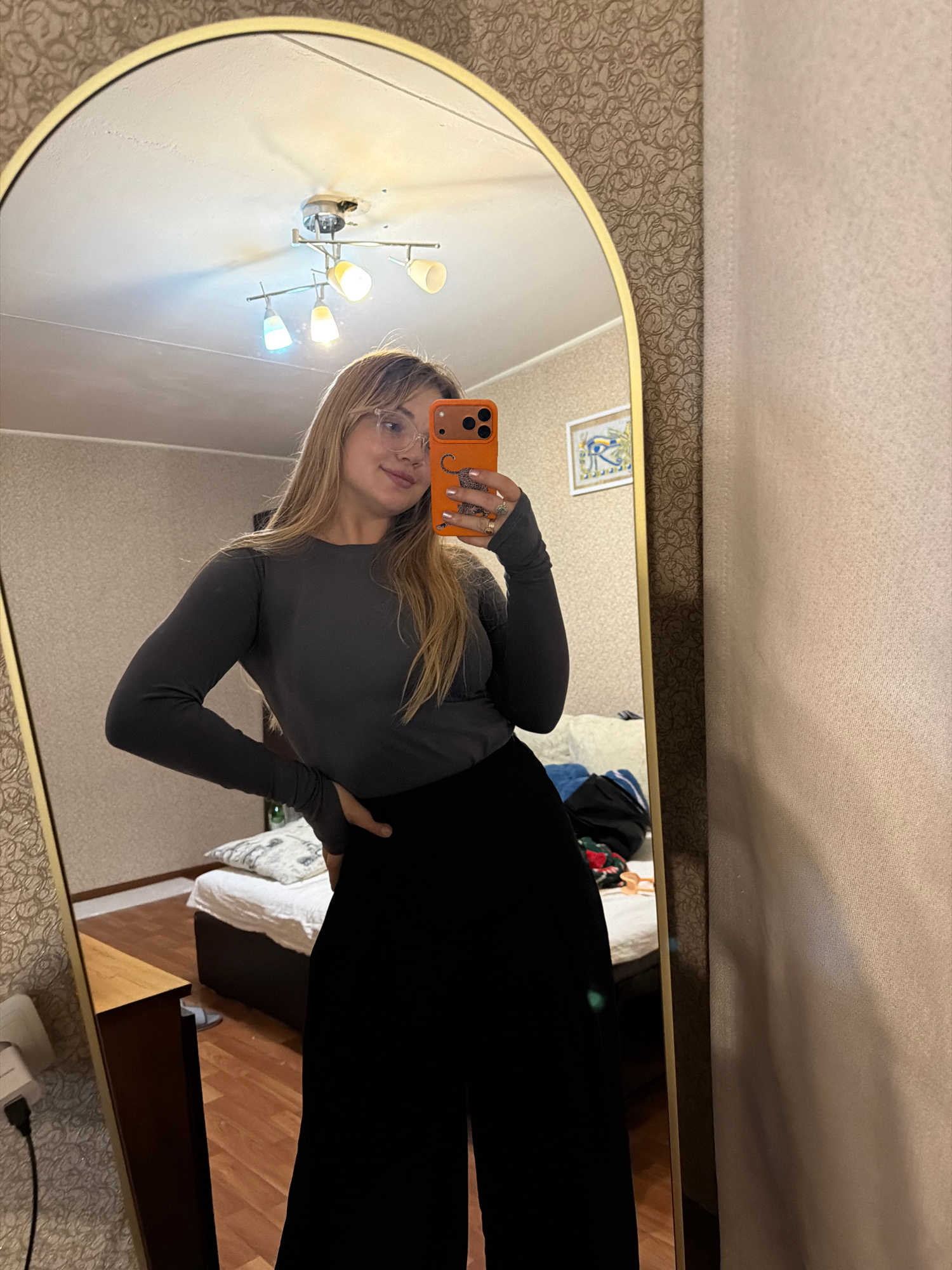 A young woman is taking a selfie in a mirror. The mirror is oval-shaped with a gold frame and is reflecting a room. The woman has long blonde hair and is wearing glasses, a gray long-sleeved shirt, anβ¦read more