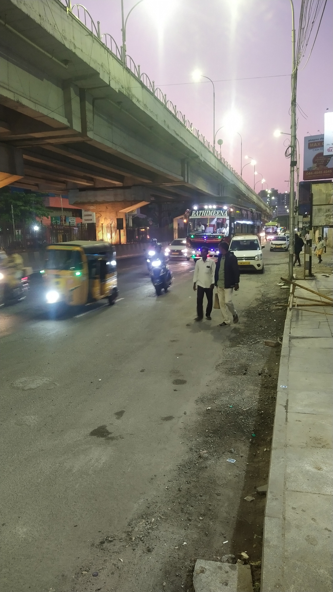 This image depicts an urban street scene at dusk or early evening, situated directly beneath a large concrete flyover identified as the Kathipara Junction Flyover in Chennai, India. The sky shows a so…read more