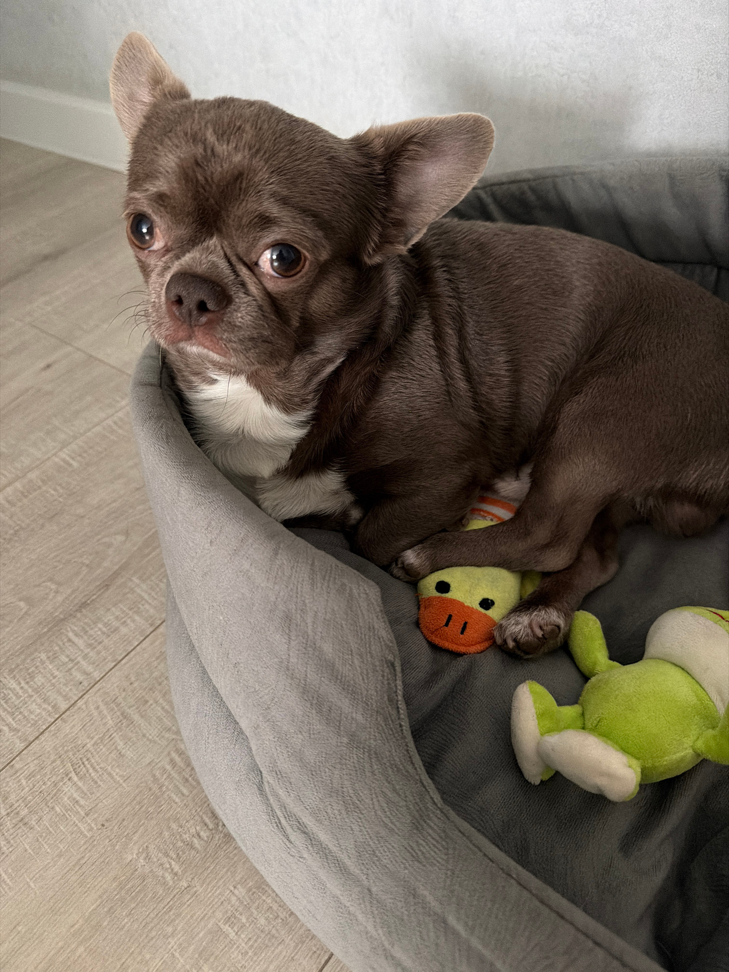 A brown chihuahua dog rests in a gray, round pet bed with raised sides. The dog is positioned with its head near the bottom left of the frame and its body curled towards the upper right. A green frog…read more