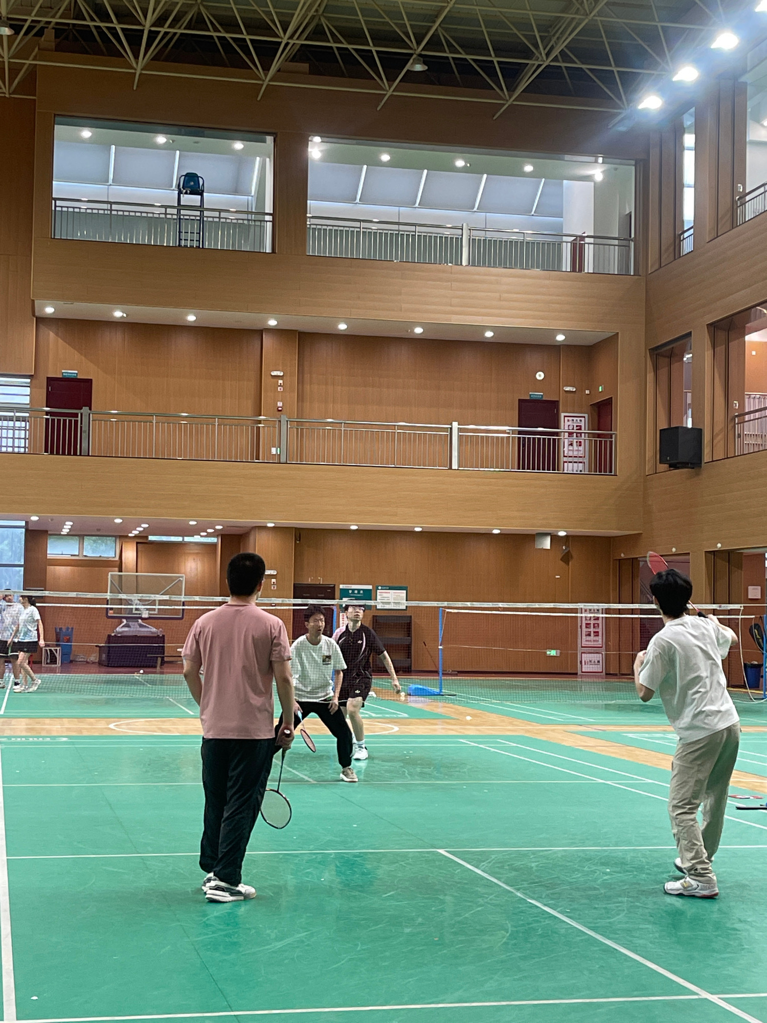 A group of people are playing badminton in a gymnasium. The location is identified as Chongqing High-tech Zone, China, based on the presence of Mandarin characters on the walls. The gymnasium has a gr…read more