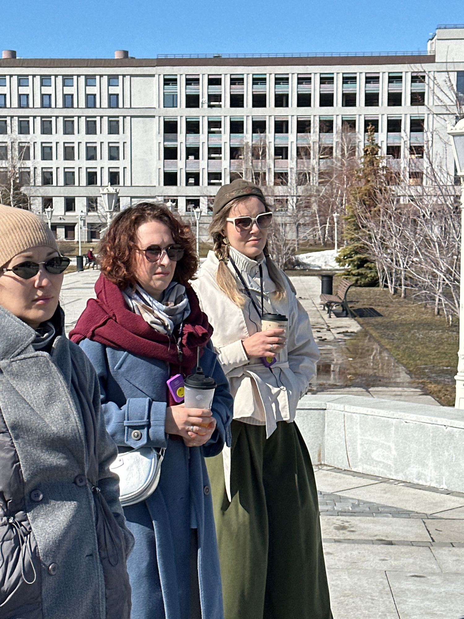 Three young women are posing outdoors, likely in Kazan, Russia, given the urban architectural style in the background. The woman on the top is wearing a light-colored jacket and a green skirt. The wom…read more