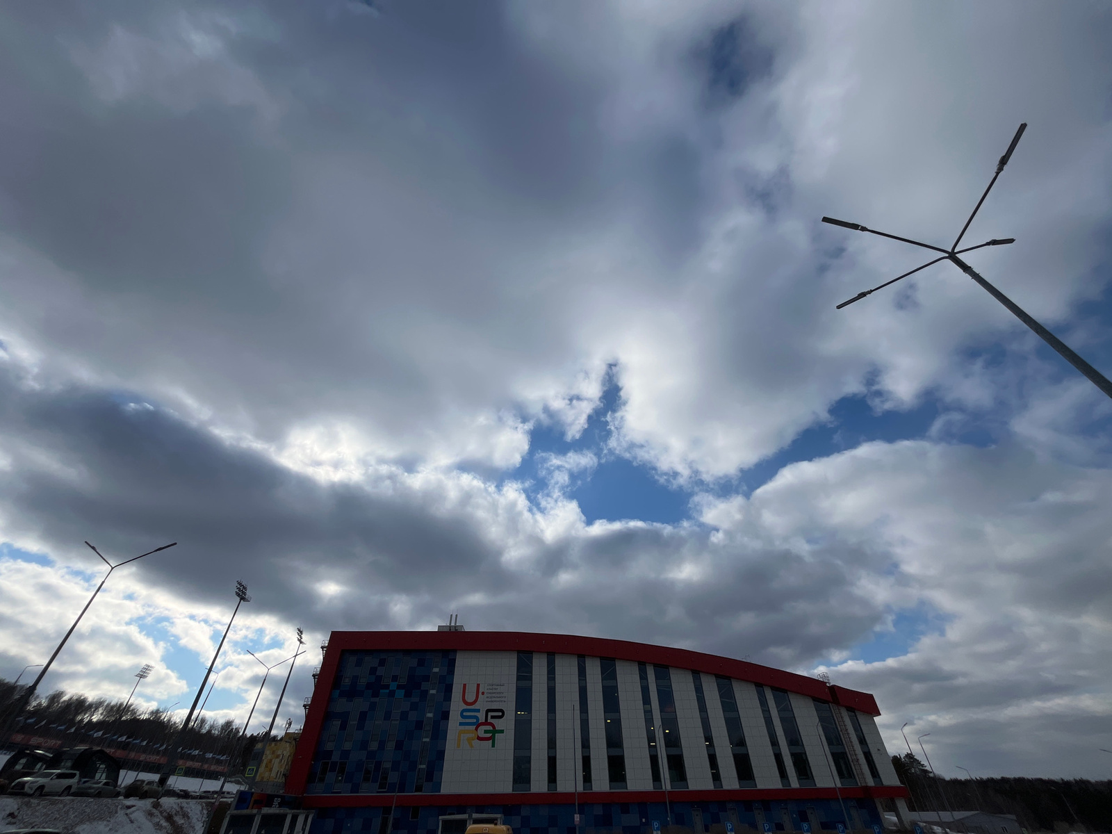 The image shows the Ice Arena "Pervomaysky" in Krasnoyarsk, Russia, on a cloudy day. The arena has a red roof, blue and white exterior walls, and the logo "U SP RGT" on its facade. Several light polesβ¦read more