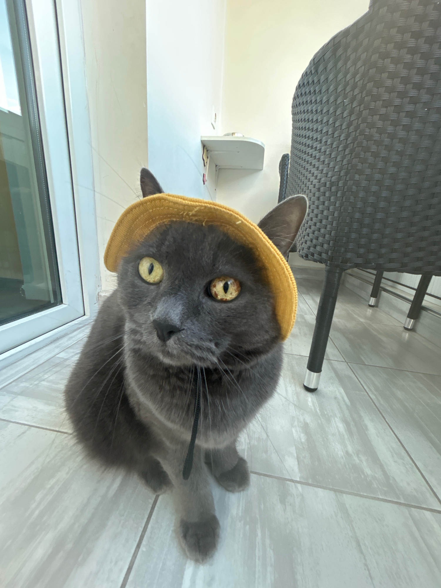 A gray cat wearing a yellow hat is lying on a light gray tiled floor. A black chair is partially visible in the background. A white door frame is visible in the lower left. The cat is looking at the c…read more