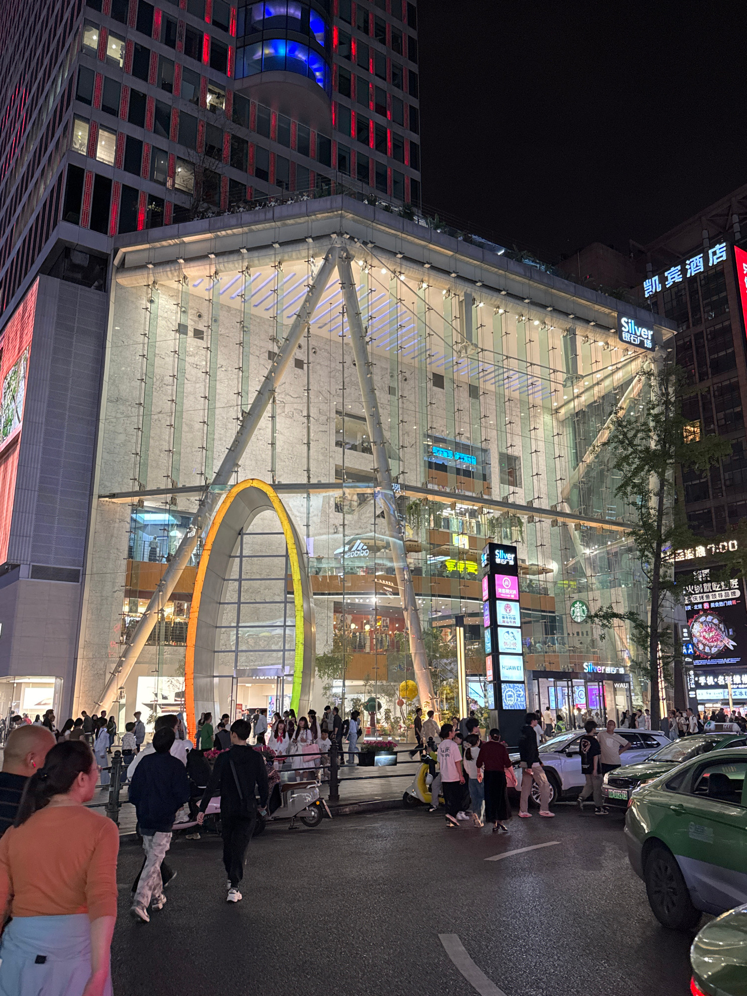 Here is a description of the image: The image shows a nighttime view of what appears to be a commercial area in Jinjiang District, China. The architecture is modern with a building featuring a glass…read more