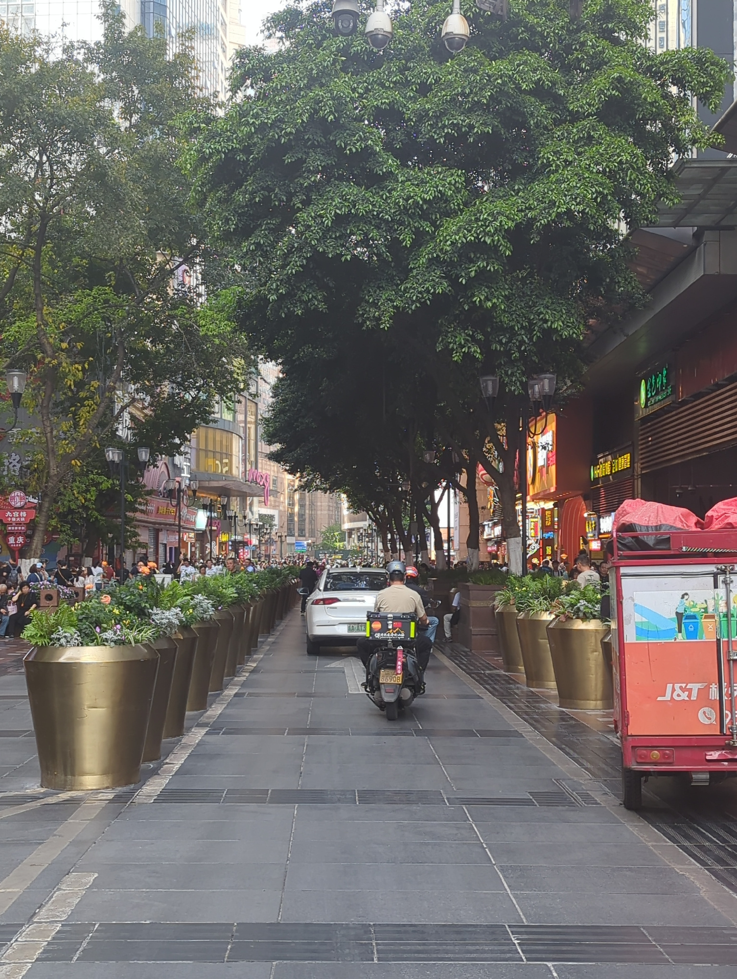 The image depicts a bustling urban street scene in Yuzhong District, China, likely a commercial or pedestrian area. The street extends into the distance, flanked by multi-story buildings and a dense l…read more
