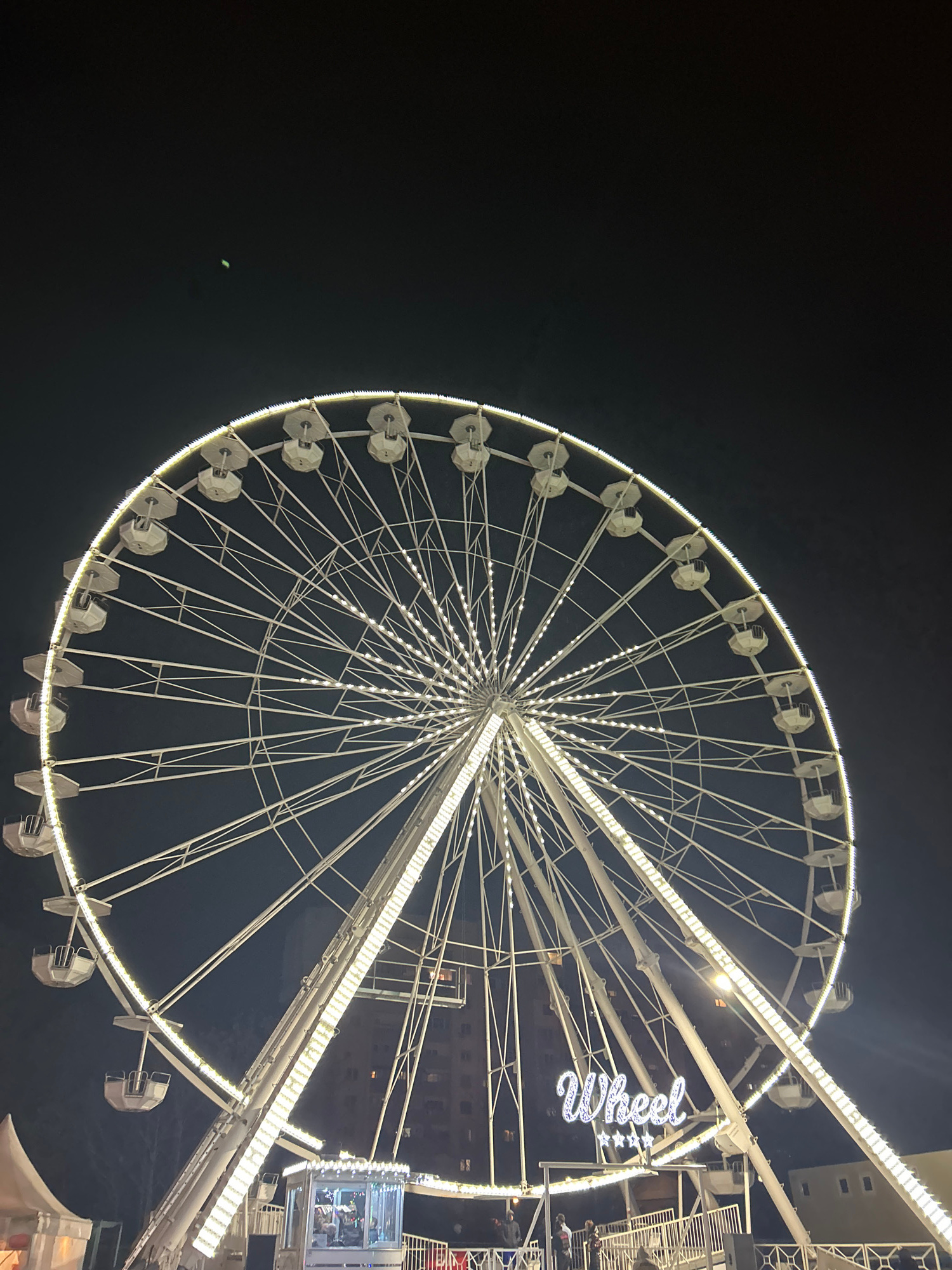 The image shows a brightly lit Ferris wheel at night. The sky is dark. The wheel is predominantly white, with lights lining its perimeter and spokes. The wheel appears to be stationary. In the backgro…read more
