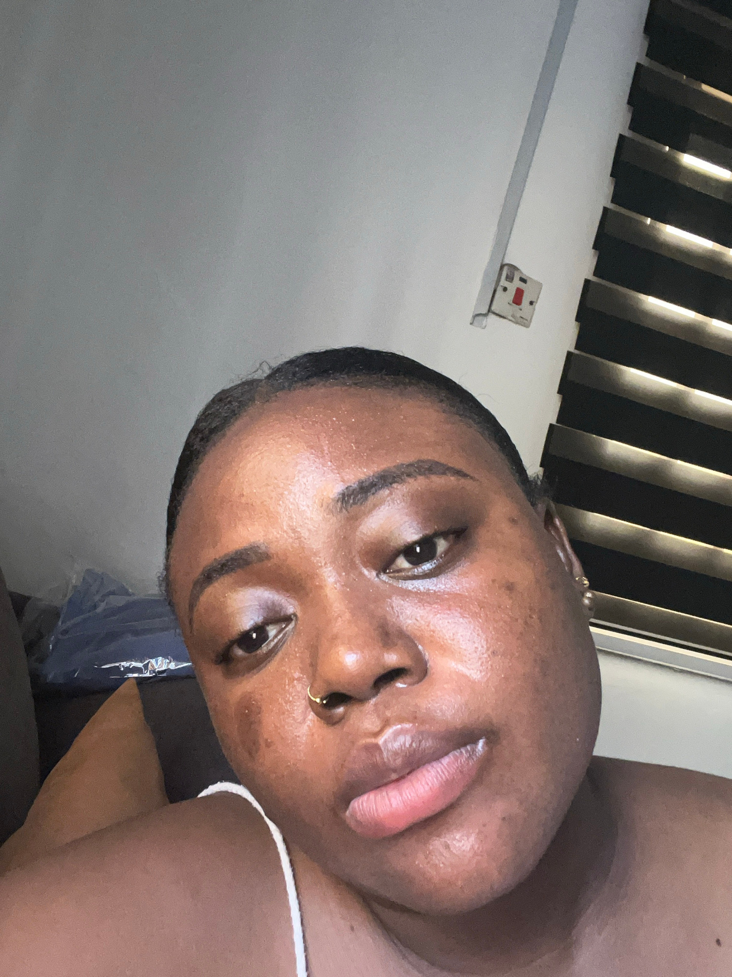A close-up, angled shot features a dark-skinned person with a visible nose ring and subtle makeup. The person is facing slightly downward toward the camera. In the background, there is a partially vi…read more