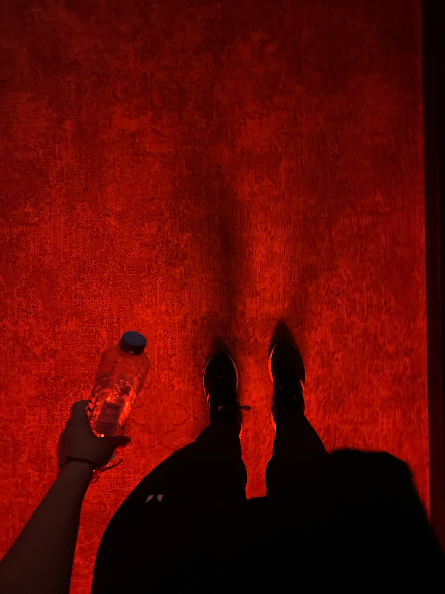 The scene is indoors, under dim red lighting. The floor is textured and appears to be concrete. A dark silhouette of a person stands on the right side of the image, wearing shoes. A hand and arm reachβ¦read more