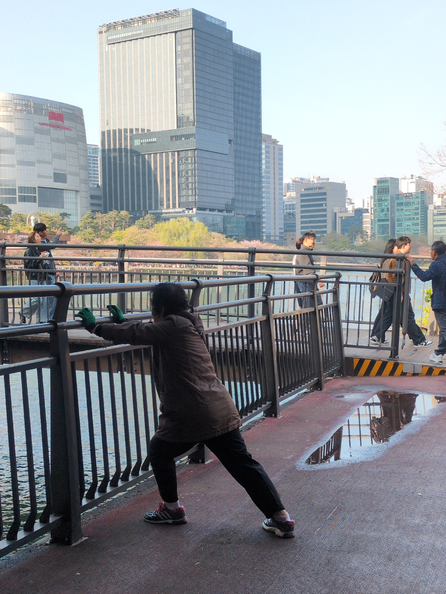 A medium shot shows a woman with her back to the camera leaning over a metal railing, resting her forearms on the upper bar. She is wearing black pants, black and pink sneakers, a brown jacket, and a hat. Her hands are covered with green gloves. A lake with gentle ripples is partially visible through the metal railing. On the opposite side of the lake is a large city. People are also leaning over the railing further down the walkway. The railing is on a red walkway. A dark stripe with yellow stripes is further down the walkway. A large puddle on the walkway shows the reflection of the buildings. The location is the west side of Seokchon Lake, Seoul, South Korea, with a view of the skyscrapers in the Jamsil district, including the Lotte World Tower. | Open Wire