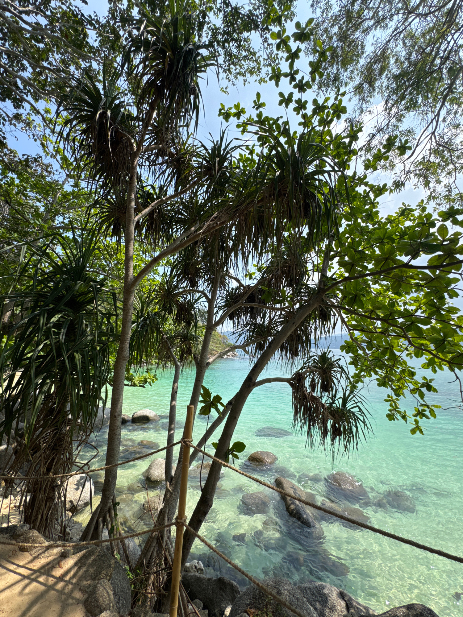 The image, taken in Patong, Thailand, captures a lush tropical coastal scene. It is oriented vertically, looking downwards from a slightly elevated position towards clear, turquoise ocean water. In t…read more