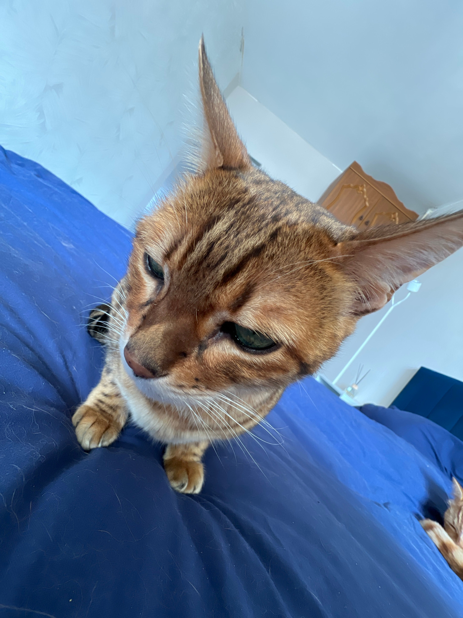 A Bengal cat with brown and black striped fur is lying on a blue bed. The cat is in an indoor environment, possibly a home. The cat's fur pattern and green eyes are visible. The photo is taken at a cl…read more