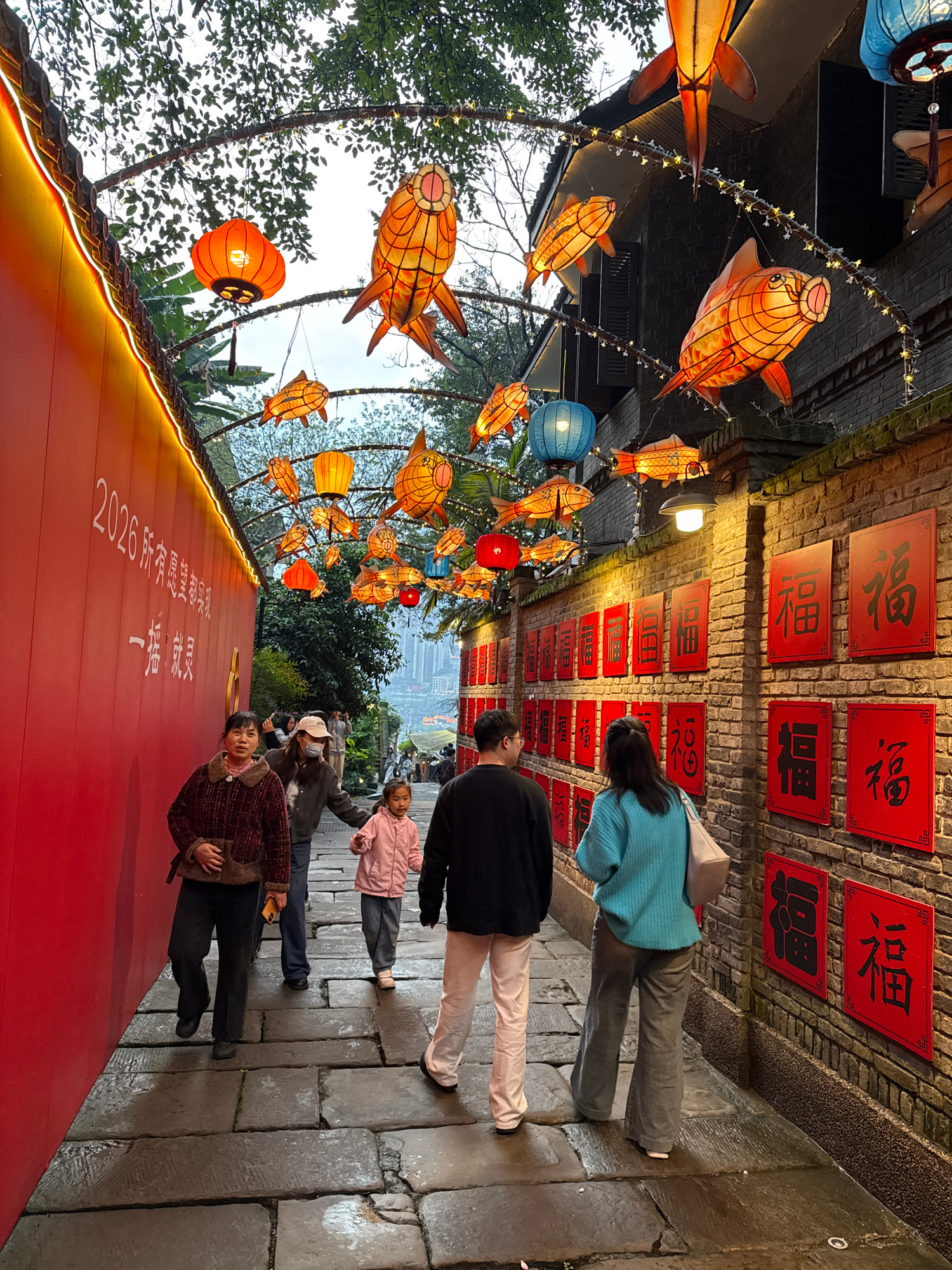 The image depicts a wet, stone-paved pedestrian alleyway in Nan'an District, China, observed during twilight. The passage is extensively decorated with festive lighting. On the left, a smooth red wall…read more