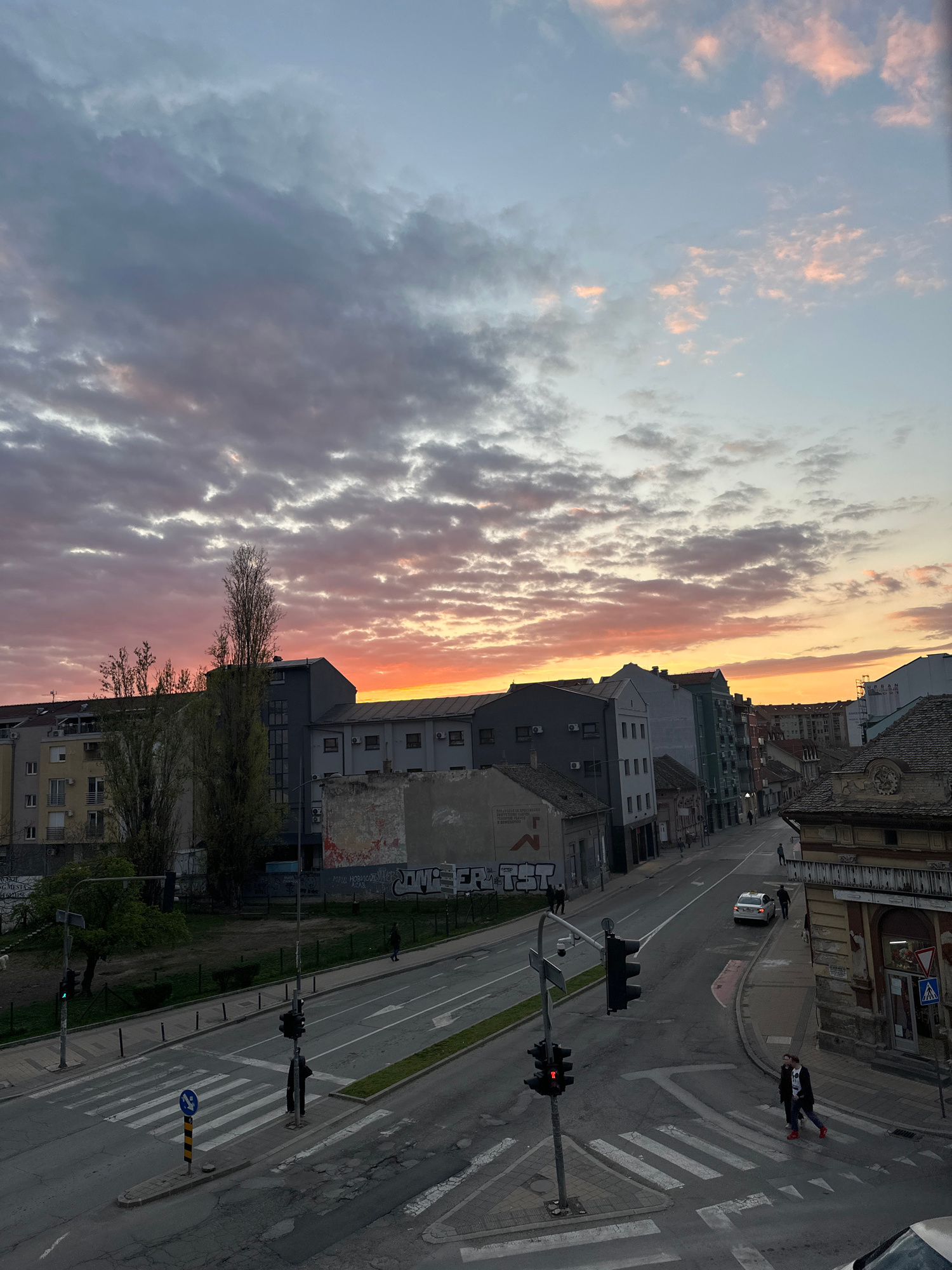 An eye-level, landscape-oriented photograph shows a street in Novi Sad, Serbia, at dusk. The sky transitions from light blue-gray on the left to orange and pink near the horizon, filled with stratocum…read more
