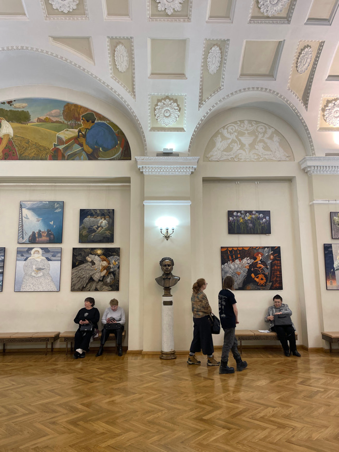 The image captures an expansive, well-lit interior hall within the Yekaterinburg Museum of Fine Arts in Yekaterinburg, Russia. The hall features high, light-colored walls with prominent architectural…read more