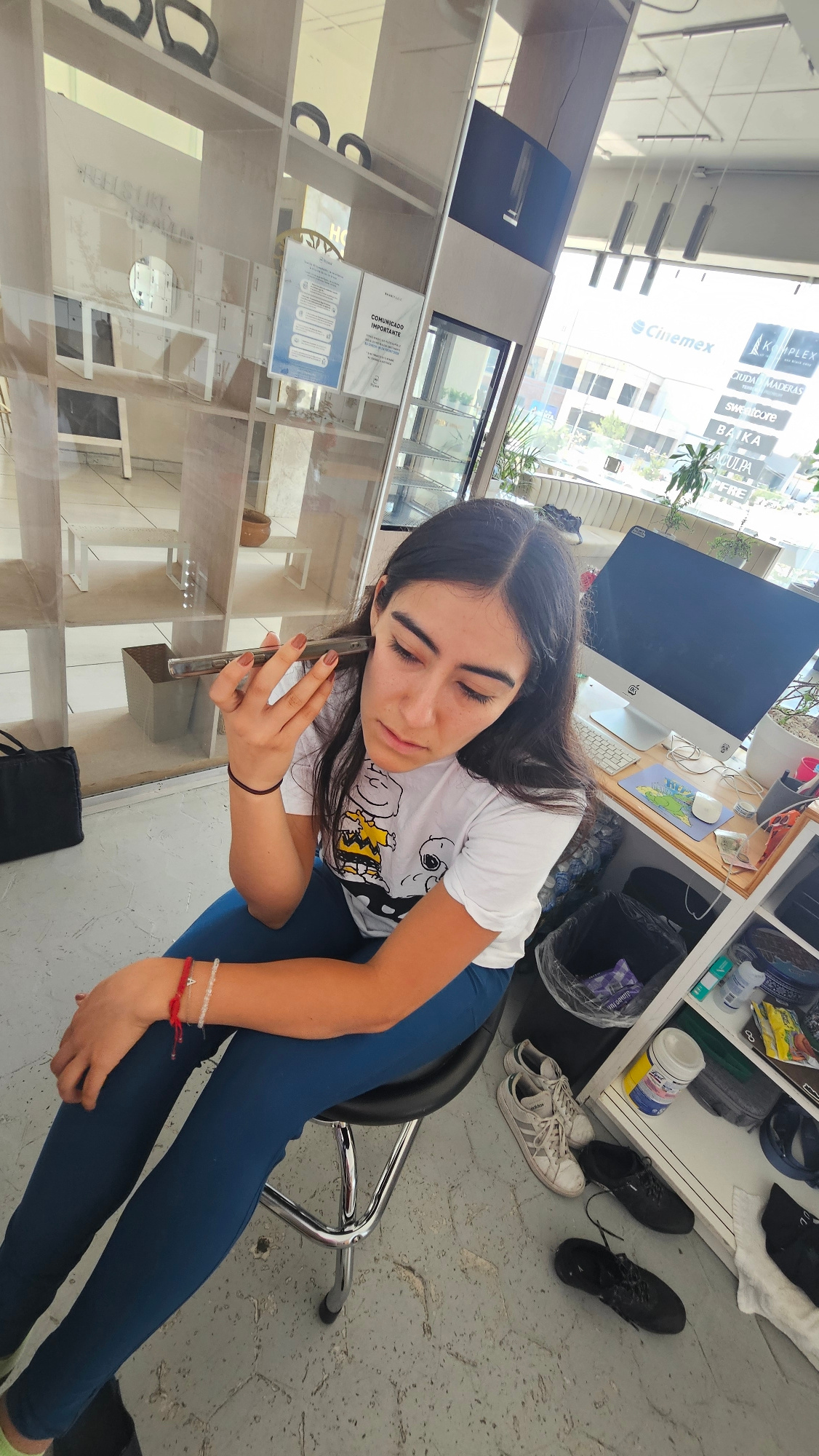 A young woman is seated on a black chair, holding a smartphone to her ear. She has long dark hair and is wearing a white t-shirt with cartoon illustrations and blue pants. She has bracelets on her wriβ¦read more