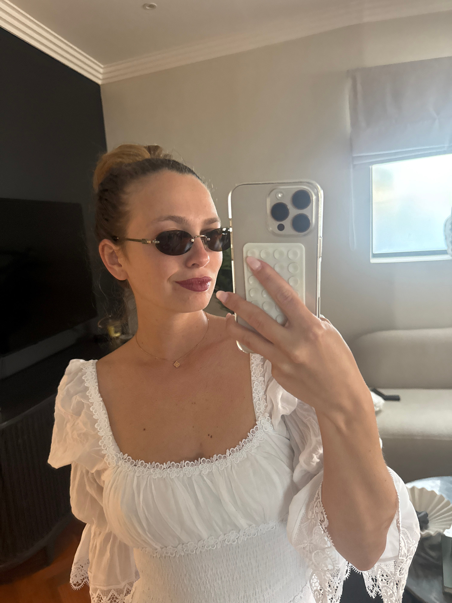 A woman is taking a selfie indoors in a room with neutral-colored walls. She is wearing sunglasses and a white, frilly top. She is holding a smartphone with a gray case in her right hand. A window isβ¦read more