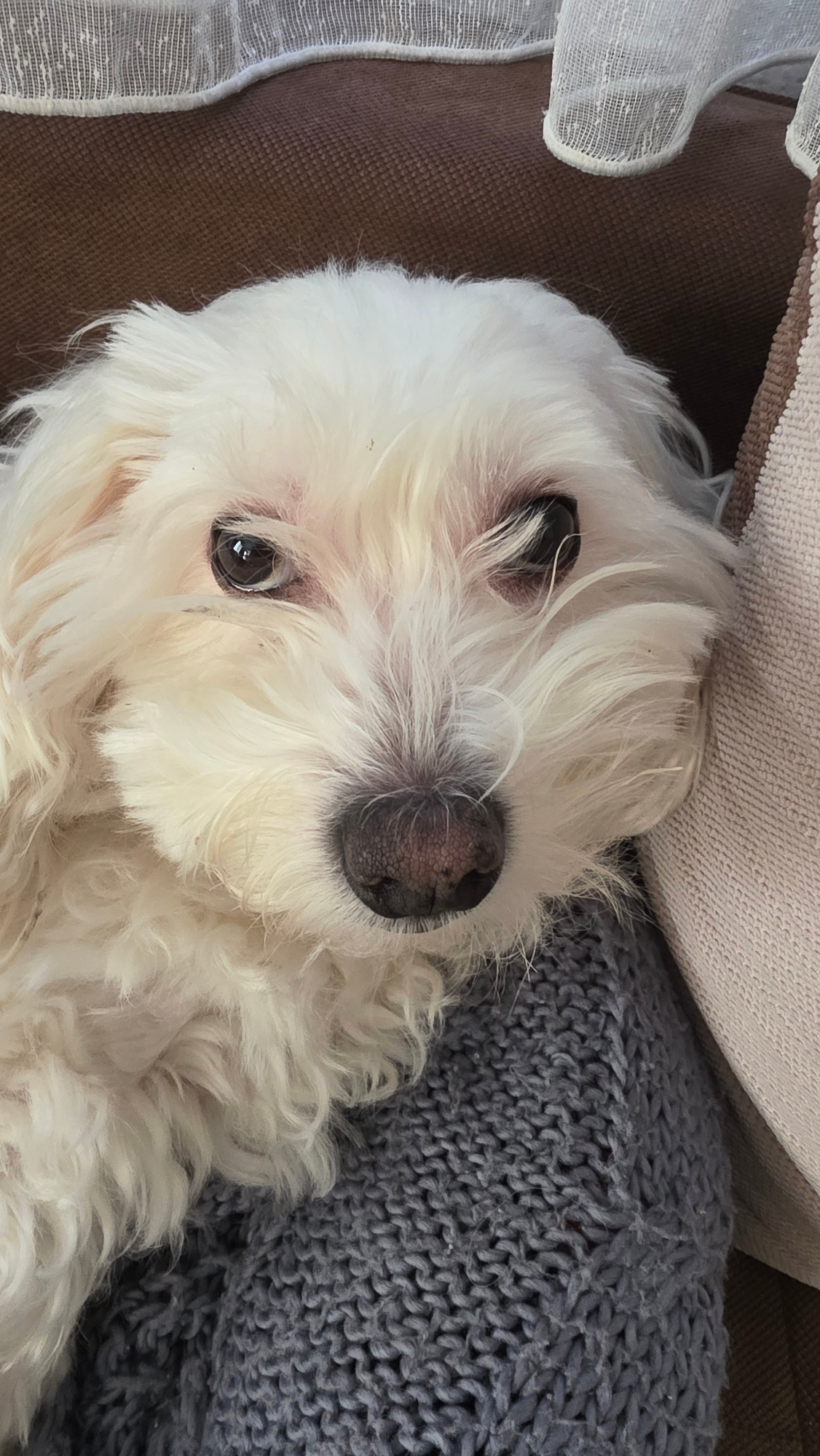 A close-up, eye-level shot features a small white fluffy dog resting indoors. The dog, likely a Maltese or similar breed, has predominantly white fur, with subtle hints of darker markings near its eye…read more