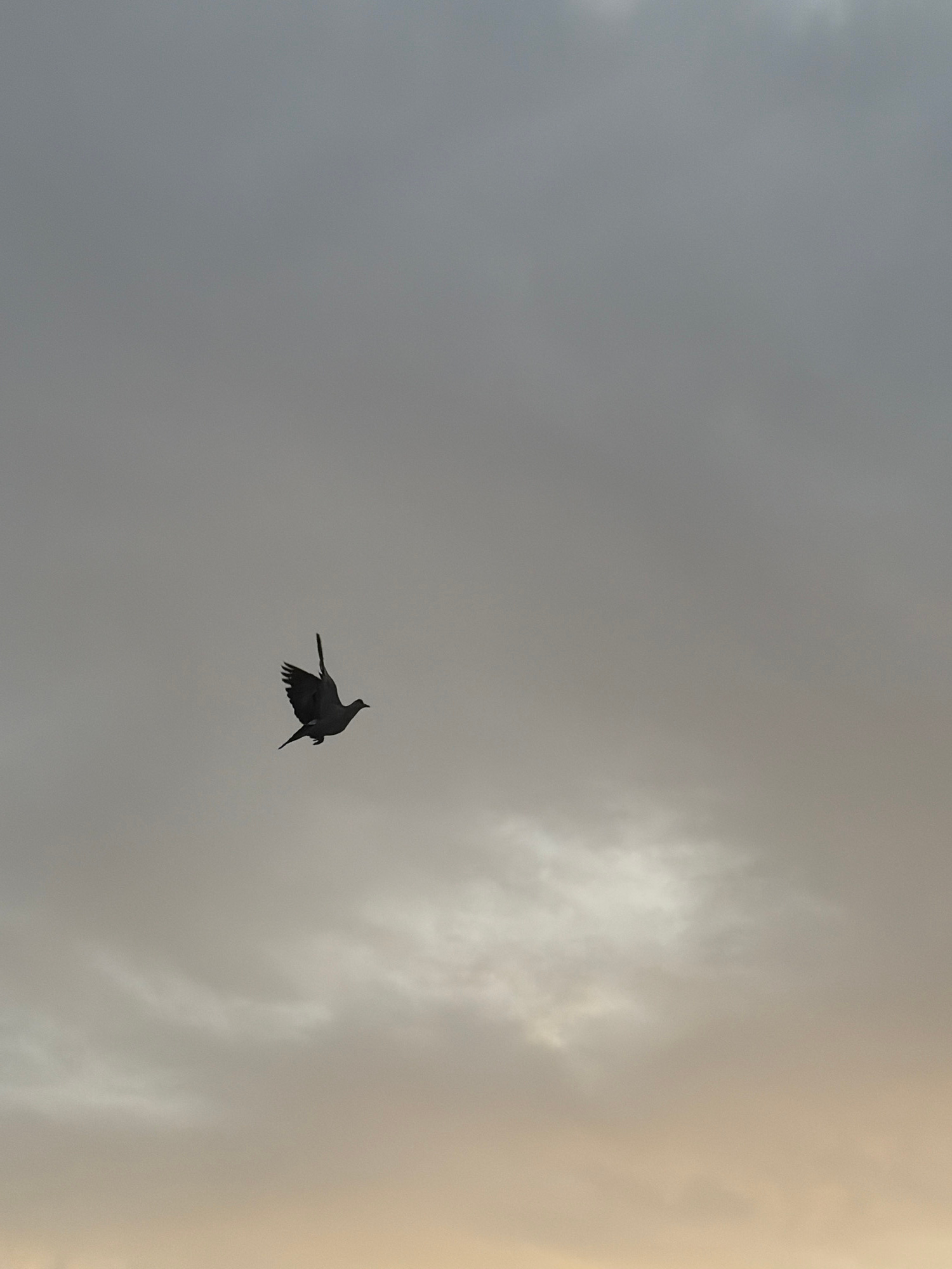 A lone, dark silhouette of a bird is captured mid-flight against a cloudy sky. The bird, likely a raptor or a large bird, is depicted with its wings spread and tail fanned, seemingly gliding or soarin…read more
