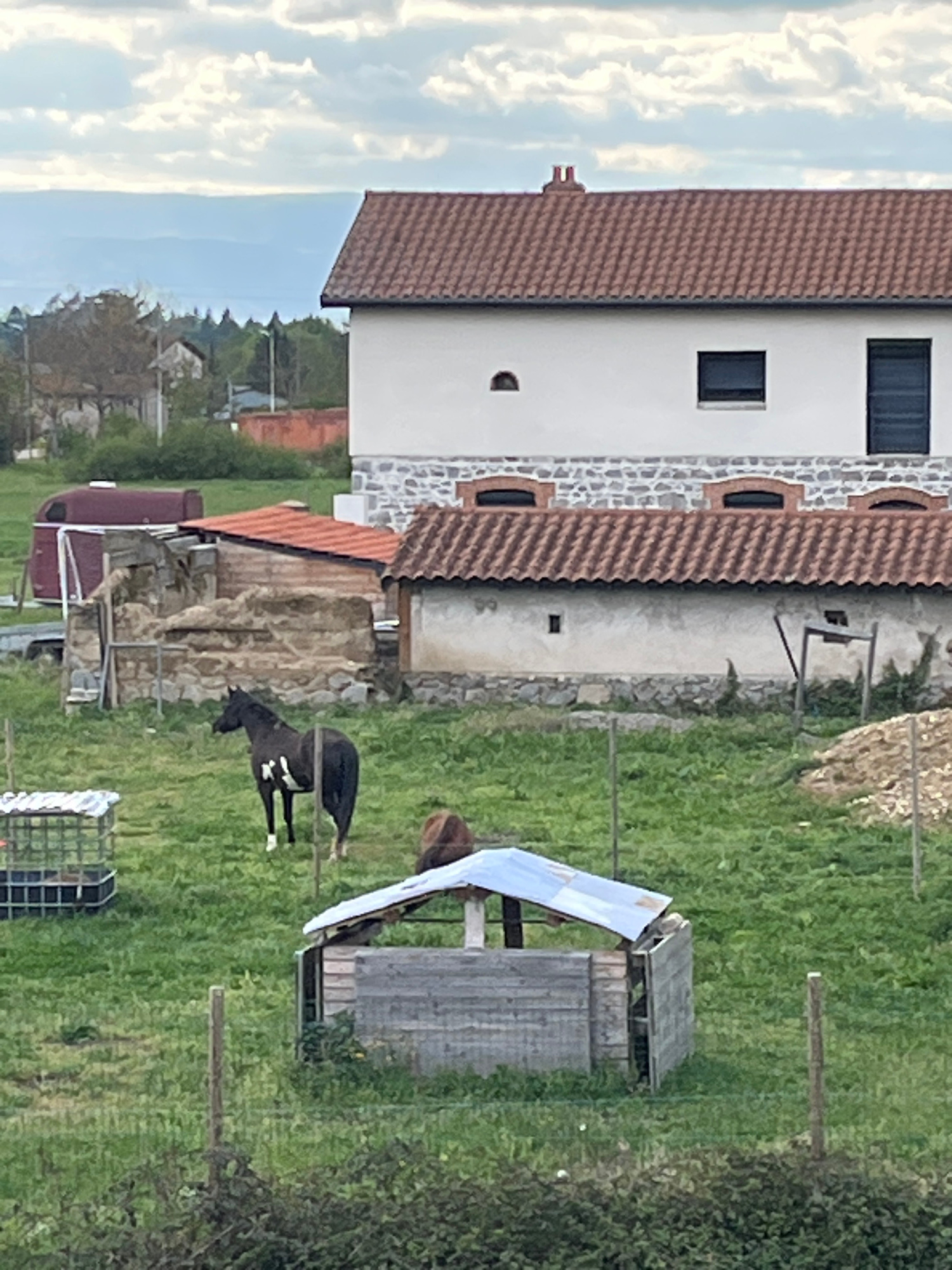The image depicts a pastoral scene near Saint-Galmier, France, featuring a building with a brown-tiled roof, white facade, and stone accents. A grassy field extends to the right of the building, where…read more