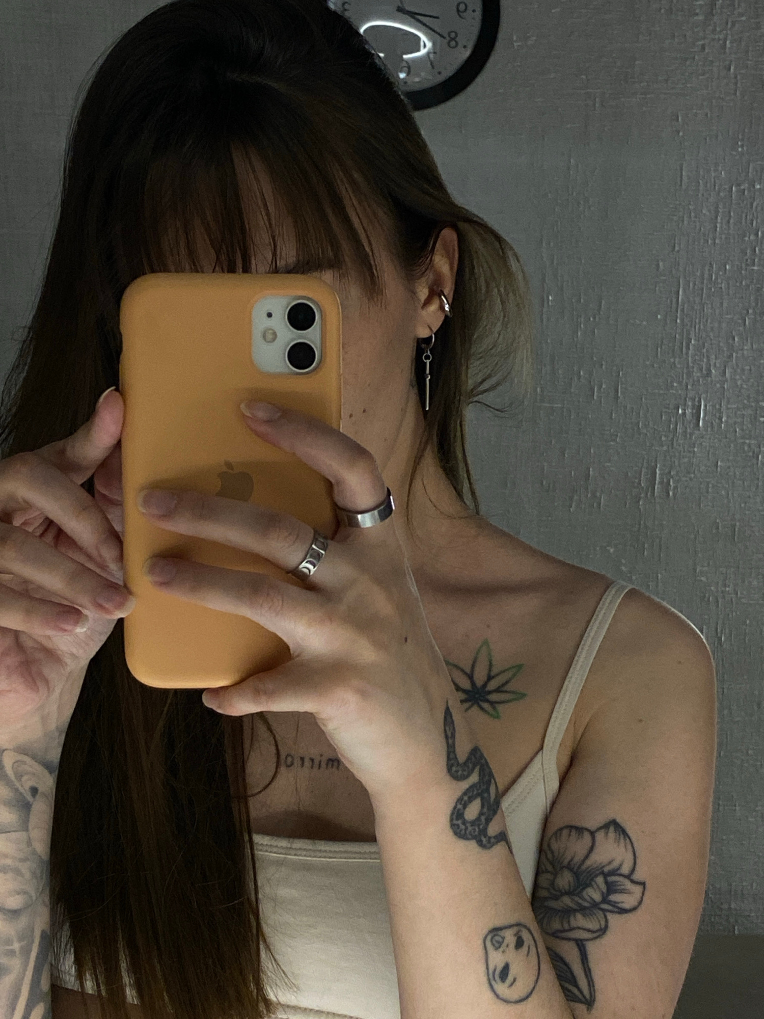 A person is holding an orange-cased iPhone in a selfie pose. The person has dark hair with bangs obscuring part of their face. Multiple tattoos are visible on their arms and shoulders: a flower, a mar…read more