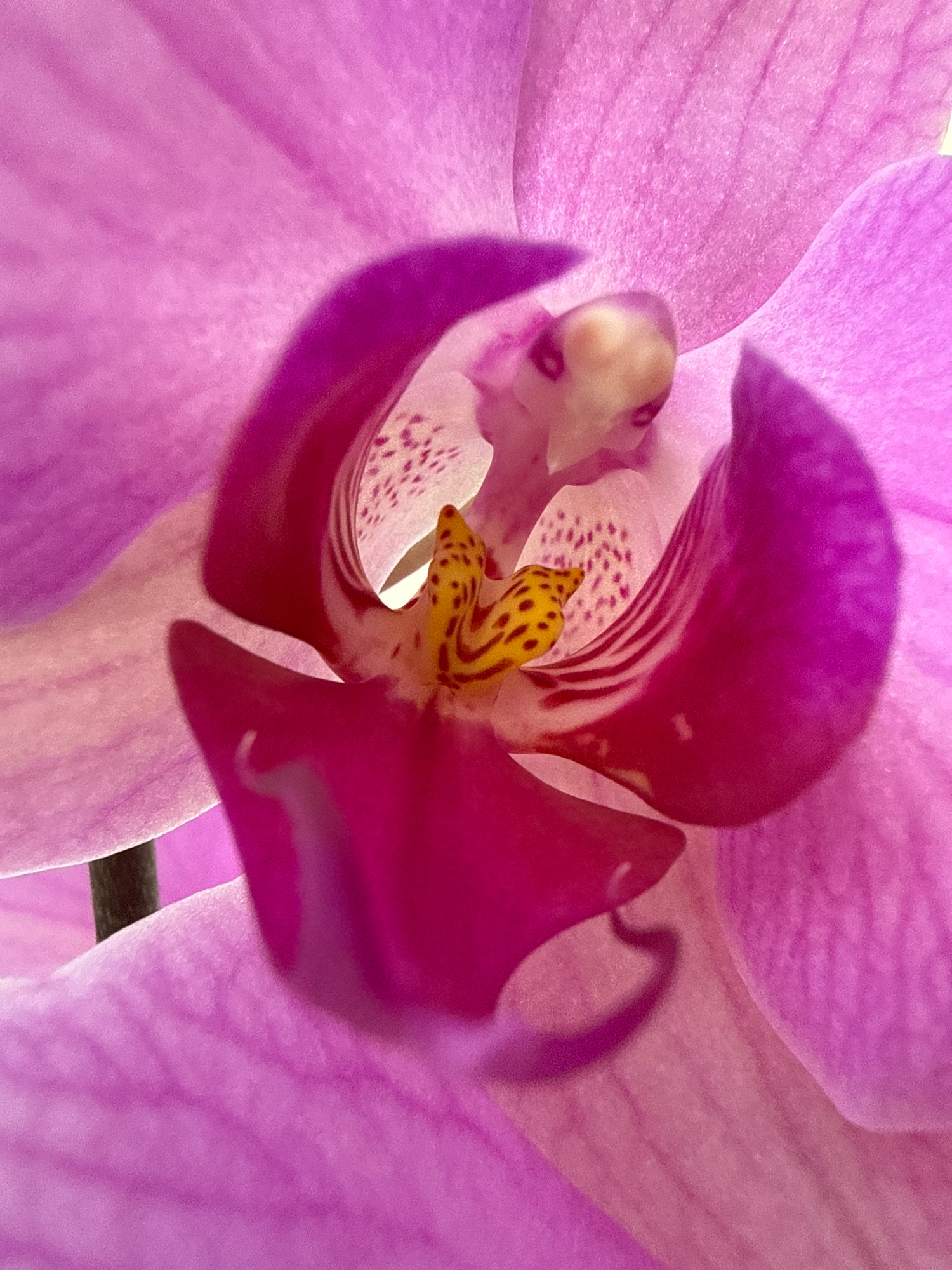 A close-up photograph shows the center of a pink and fuchsia orchid blossom. The petals are soft and textured. The flower's inner structure features yellow with brown speckled markings. Some petals ha…read more