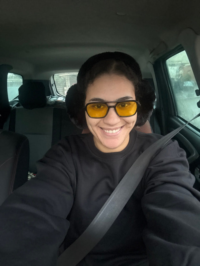 A woman smiles broadly in a car selfie, wearing black earmuffs and yellow-tinted glasses. She wears a black long-sleeved shirt and a grey seatbelt crosses her chest. The car's interior is visible, inc…read more