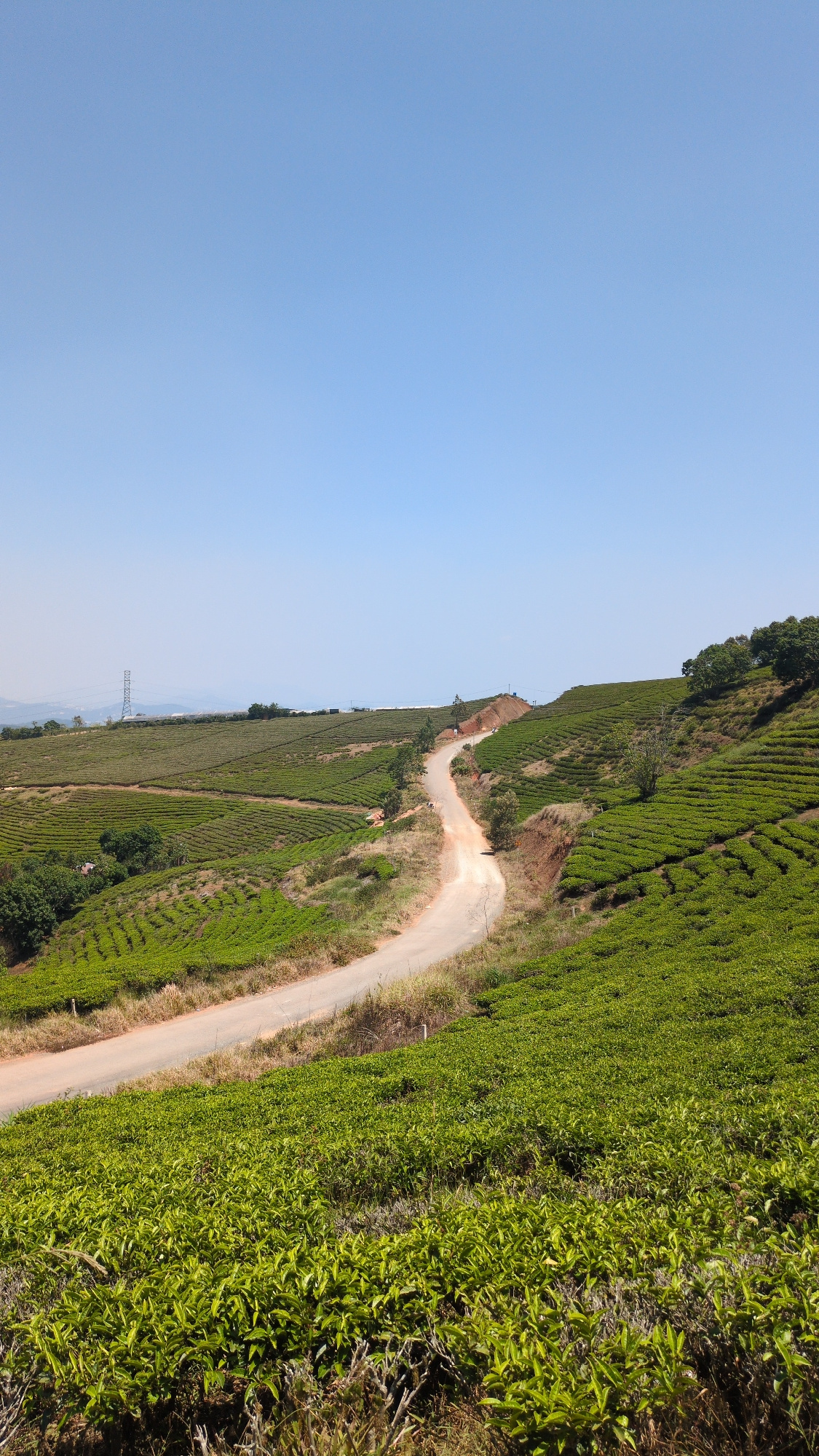 A long dirt road cuts through a hilly landscape in Trường Thọ, Vietnam. The road curves up and around a hillside covered in terraced rows of green plants, likely tea bushes. Clear blue sky takes up a…read more