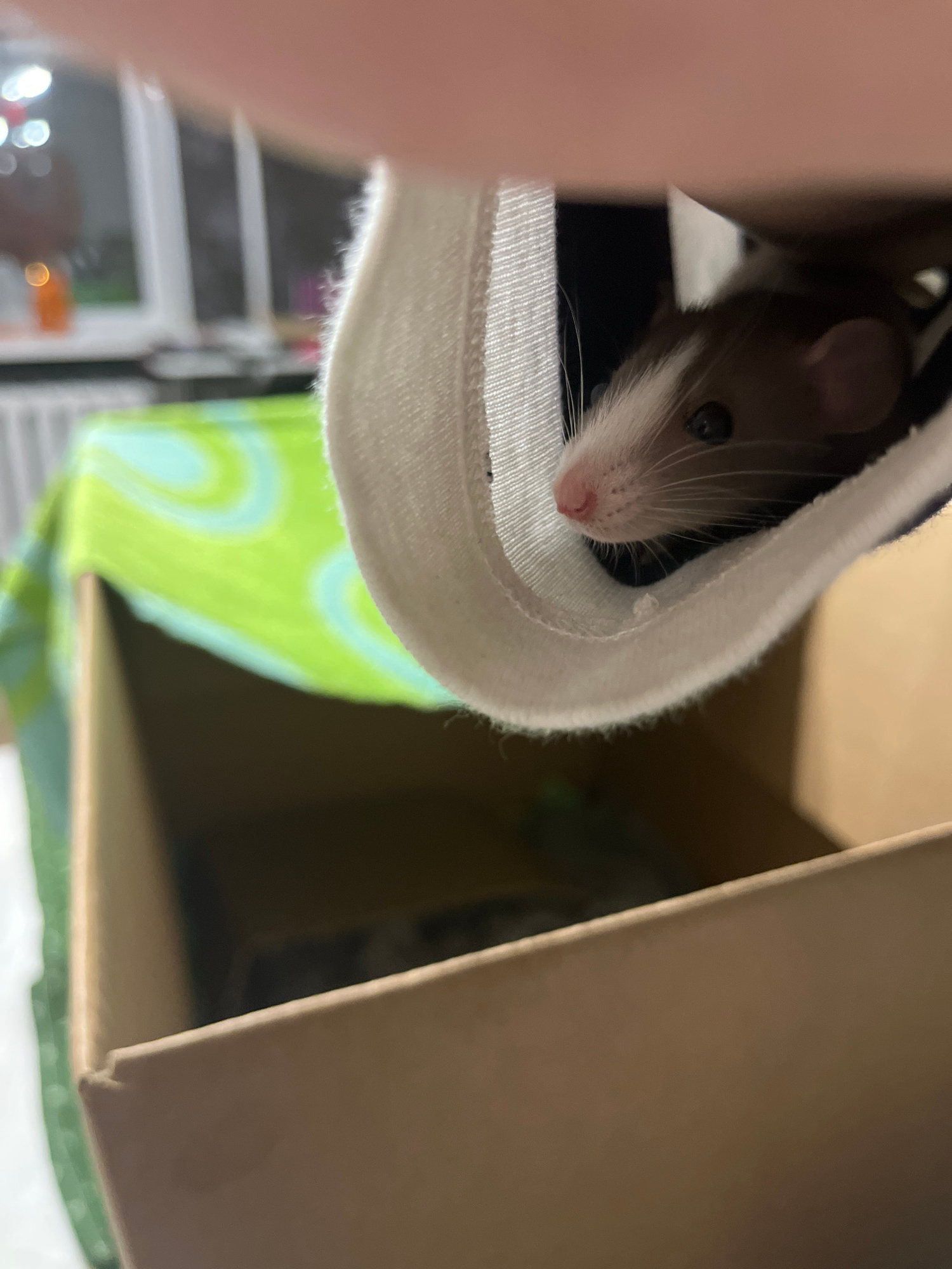 A brown and white rat is peeking out from a white and black cloth tube. The tube is likely inside a cardboard box, part of which is visible in the upper right corner. A green and blue patterned materi…read more
