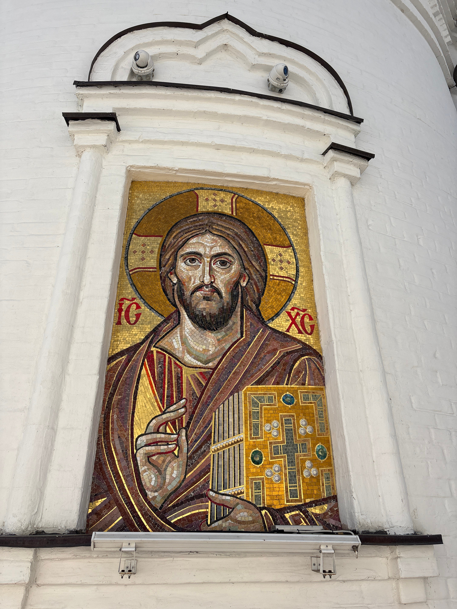 The image shows a mosaic of Jesus Christ mounted on a white wall. The mosaic features Jesus' head, halo, and part of his upper body with his hand raised in blessing. The mosaic is primarily composed o…read more