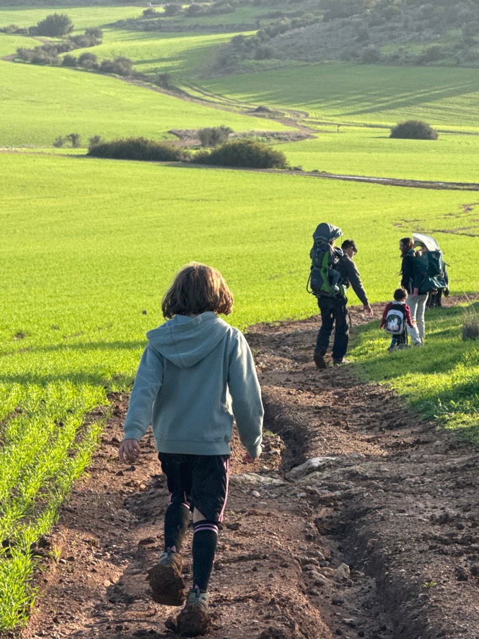 The image displays a group of five individuals, including adults and children, traversing a muddy dirt path through verdant agricultural fields in the Mate Yehuda Regional Council, Israel. In the fore…read more