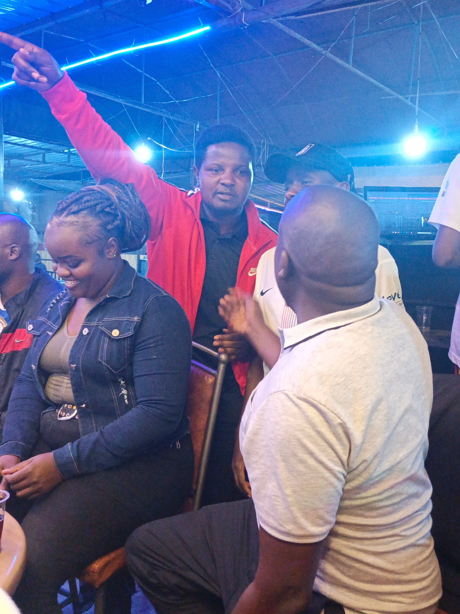 The image depicts a group of people indoors, likely in a bar or entertainment venue in Nairobi, Kenya, based on the style of lighting and apparent social setting. The illumination primarily comes from…read more