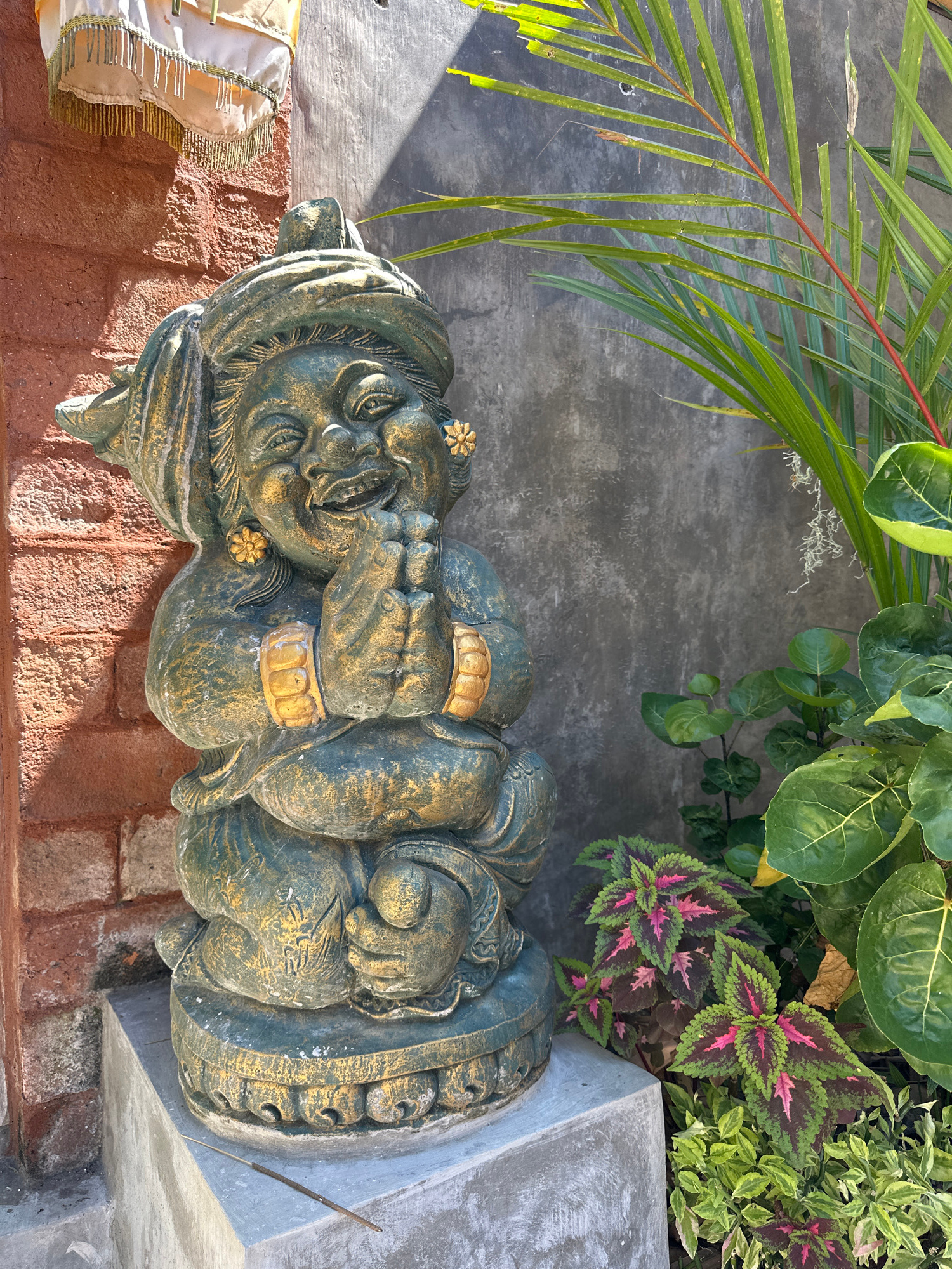 The image captures a weathered, ornate statue of a deity, situated in what appears to be an outdoor setting. The statue is made of a dark, possibly stone or concrete material, with gilded accents. It…read more