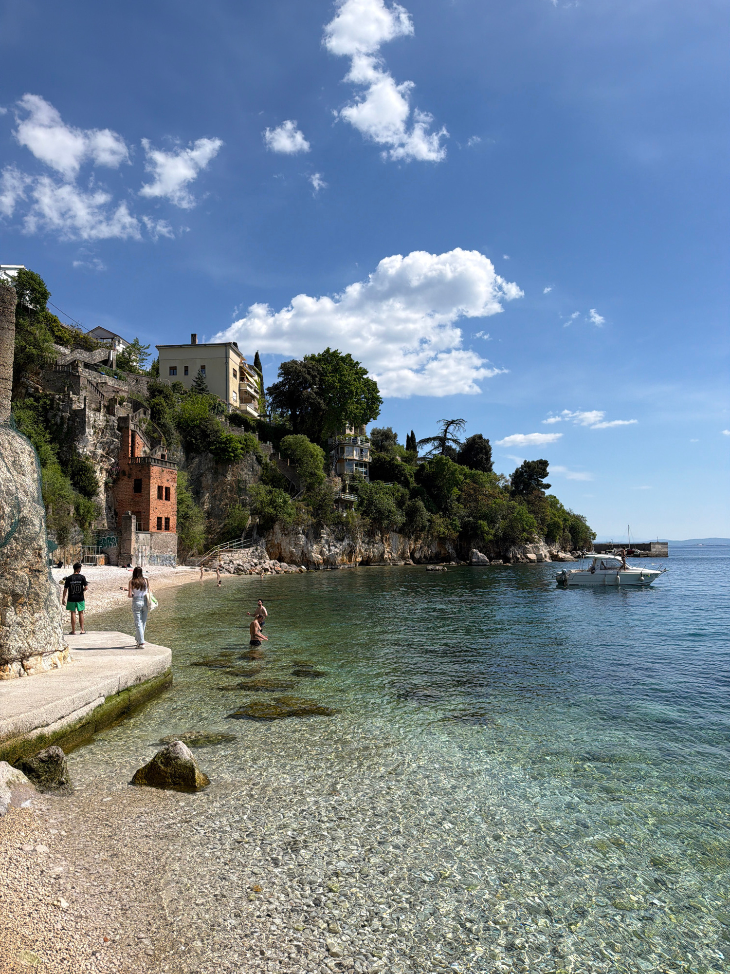 The image depicts a coastal scene in Grad Rijeka, Croatia. The landscape features a steep, rocky cliff with greenery and buildings nestled on different levels. A partially ruined brick structure with…read more