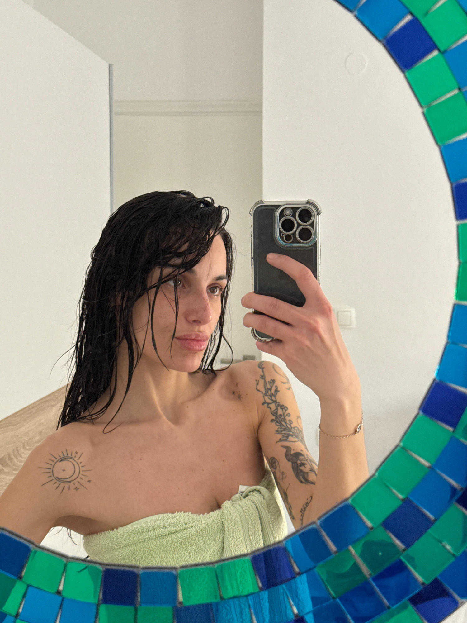 A woman takes a selfie in a bathroom mirror. She has wet, dark hair and a tattoo on her left shoulder. She holds an iPhone in her right hand. The mirror has a frame of blue and green tiles. She wears…read more