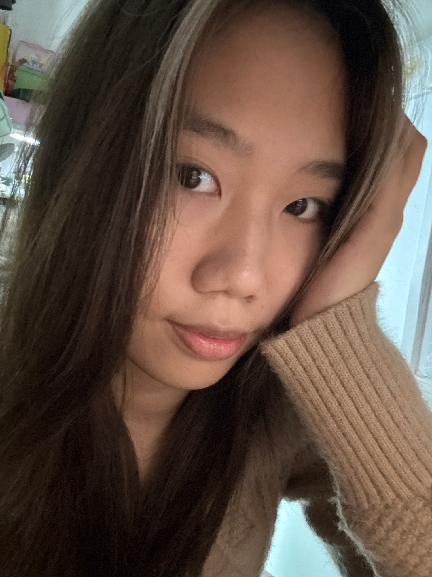 A close-up, slightly angled selfie of a woman with dark brown hair is shown. She is wearing a light brown sweater. Her face is the primary focus, with visible eyes, nose, and lips. The background is o…read more