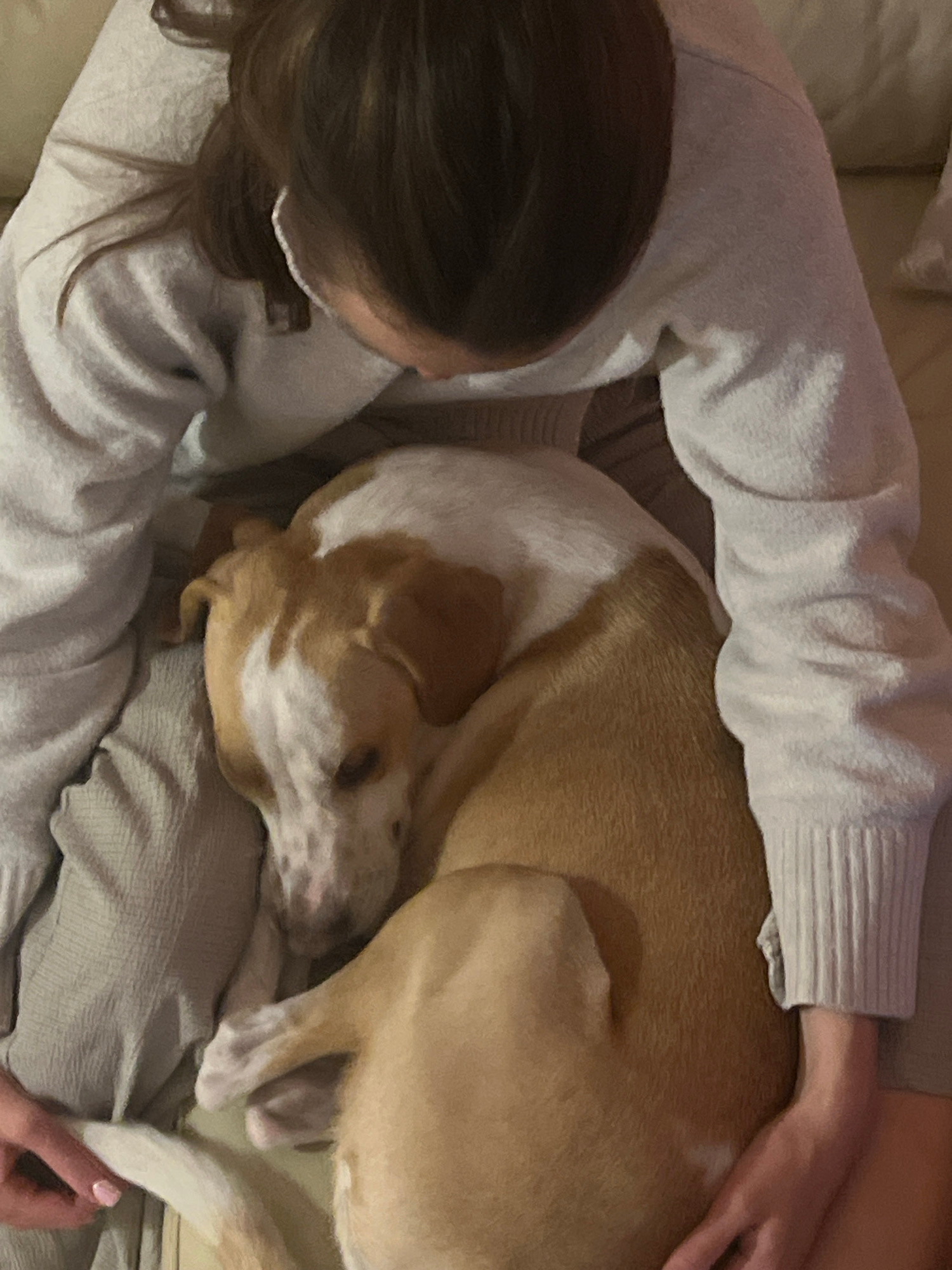 The image captures a serene, top-down view of a person embracing a dog in a cozy indoor setting, possibly in Budva, Montenegro. The person, whose back of the head and shoulders are visible, has dark b…read more