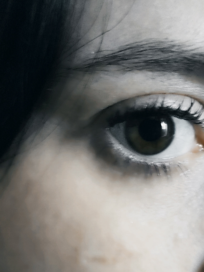 The image presents an extreme close-up, high-magnification view of a human eye, located in the city of Donetsk, Ukraine. The subject is a single, open eye, specifically the right eye, filling the majo…read more