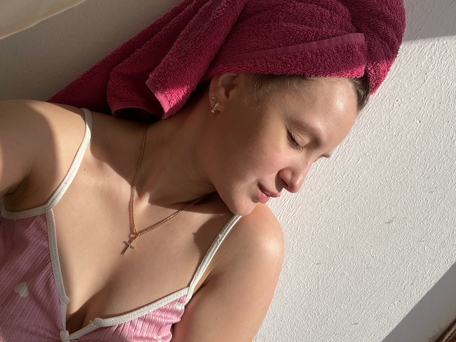 A close-up, high-angle shot depicts a person, likely a young woman, lying down and resting indoors in Марковский, Russia. Her head, with closed eyes and relaxed facial features, is turned slightly upw…read more
