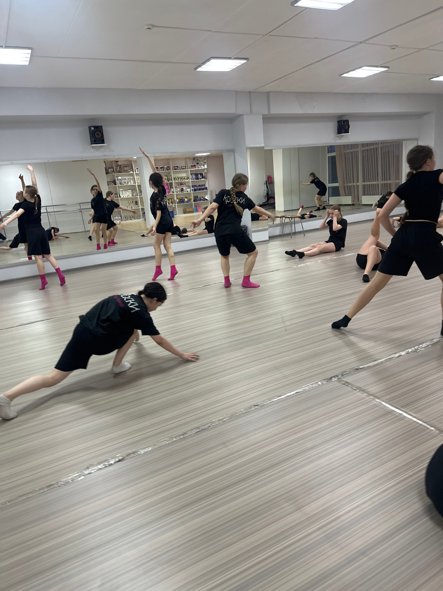The image shows a group of young dancers in a dance studio, likely located in Votkinsk, Russia, given the lettering on their shirts. The studio has a wooden floor and mirrored wall. The dancers are we…read more