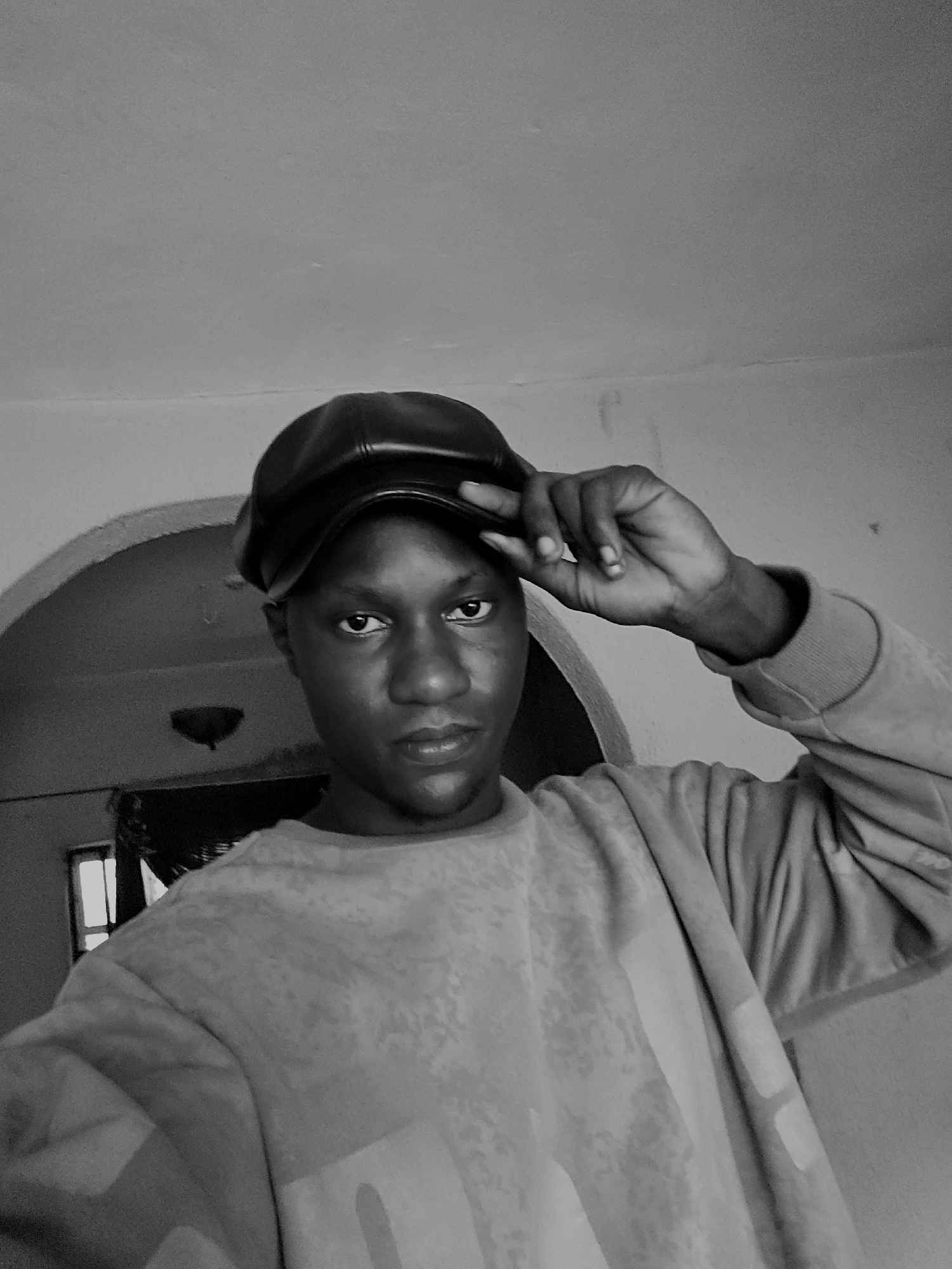 A young Black man wearing a cap and a sweater is depicted in this black and white photo. The man looks directly at the camera, with his right hand lightly touching the brim of the cap. He appears to b…read more